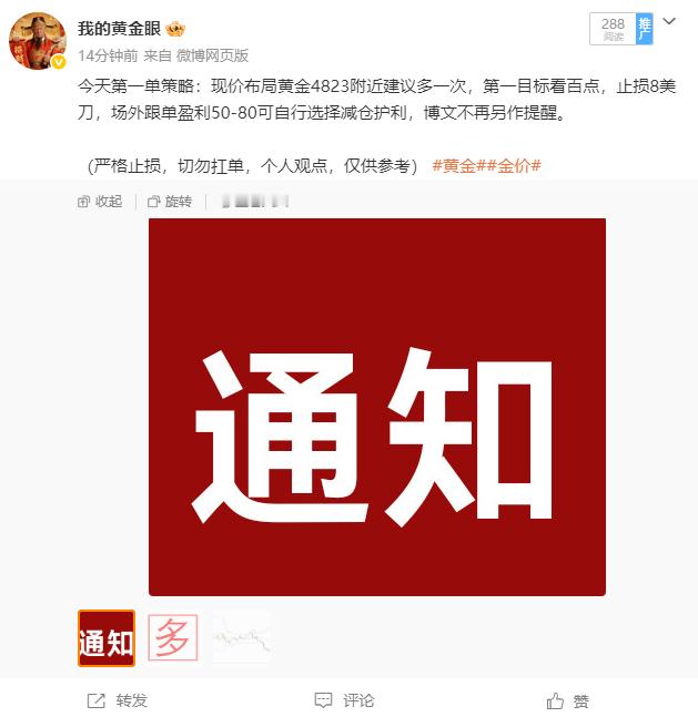 黄金策略十一连胜!!!早上第一单策略4823多单行情一路上升至4830,斩下70个点的利润,跟单的朋友可以考虑是该减仓还是全部落袋了,跟大家说下我的操作:已经减仓一半,把利润先揣进兜里,剩下的继续拿着看更高。还是那句话,不求每单吃满百点利润,风险控制永远优先于利润追求。黄金金价
