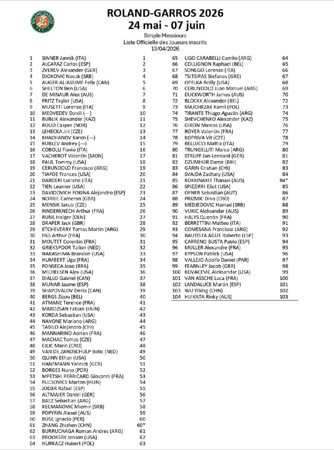 五位中国选手入围法网正赛罗兰加洛斯 2026法网单打正赛名单公布❗️