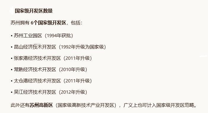 苏州是拥有国家级开发区数量最多、开放型经济平台最完整的城市之一,苏州高新区广义上也可计入国家级开发区范畴。