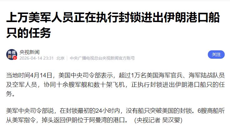 当地时间4月14日,美国中央司令部直接说了,出动了一万多海军、海军陆战队和空军,还有十几艘军舰、几十架飞机,专门盯着所有进出伊朗港口的船,不让它们随便过。