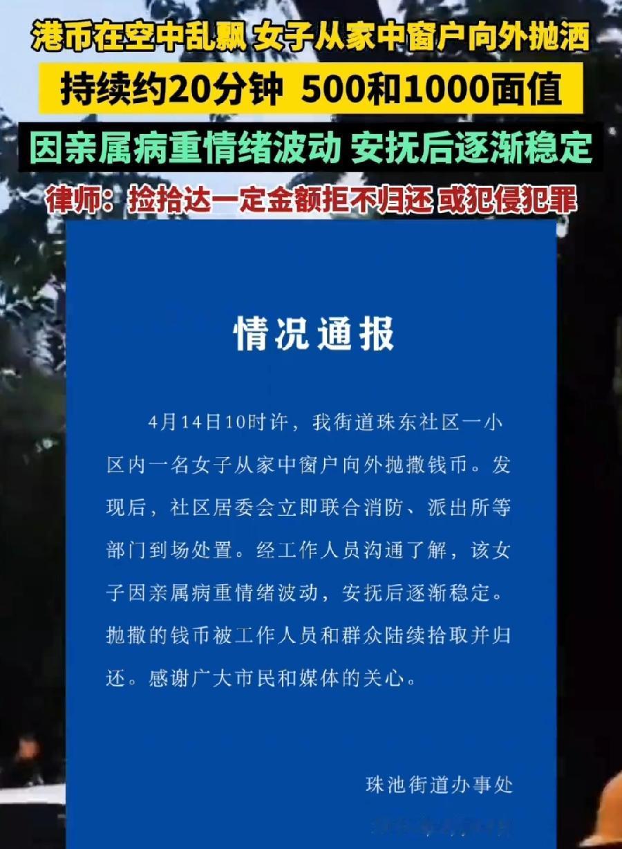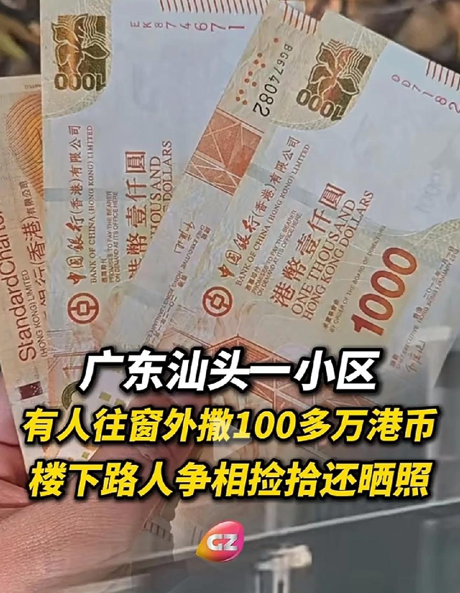 汕头女子高空窗户撒钱,因为亲属病重情绪波动,可见生命面前,钱财买不来健康!健康才是财富,没有健康,要钱有什么用!撒的全是港币,家里做外资外贸生意的,再看女子气质,家里根本不差钱!奈何重病,肯定基本回天乏力绝望了!所以,这不是一个看热闹、撒钱捡钱的新闻,而是警示世人!健康永远第一位!失去了才知道珍贵!