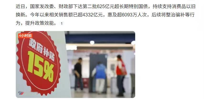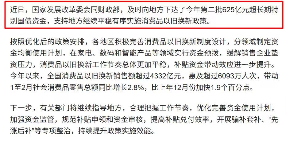 近日,国家正式下达第二批625亿元超长期特别国债,持续加码支持消费品以旧换新政策。