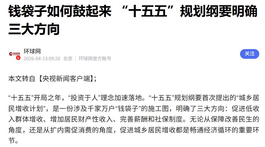 刷到新闻,“十五五”规划纲要首次提出城乡居民增收计划,明确了三大方向:促进低收入群体增收、增加居民财产性收入、完善薪酬和社保制度,这个方向真的说到了老百姓心坎里。