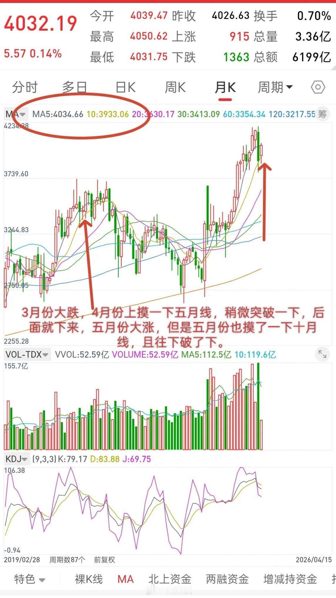 而现在不也是往上摸了一下五月线,甚至稍微突破下了吗,所以接下来就看十月均线,目前十月线是3933。