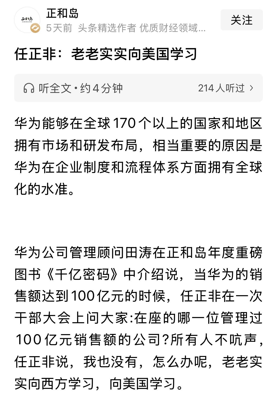 张维为从来都是俯视美国,而任正非一直在讲向美国学习,甚至讲,你想活下去,你就要向美国学习,除非你不想活下去,即使,他制裁我们,也要向美国学习。你觉得谁说的对?