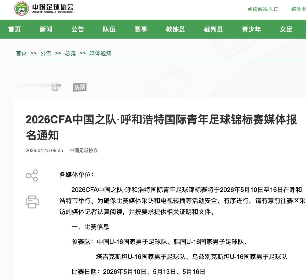 4月15日,中国足协通过官方渠道发布了呼和浩特国际青年足球锦标赛媒体报名通知,上面显示,2010年龄段中国U16男足将于5月10日至16日在呼和浩特市国家北方足球训练基地与来访的乌兹别克斯坦、塔吉克斯坦、韩国3支同龄球队进行比赛。与其他国字号球队一样,U16国足在备战的问题上,始终坚持“与强队练兵”的原则。