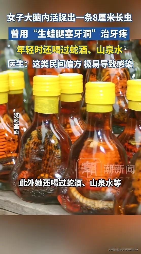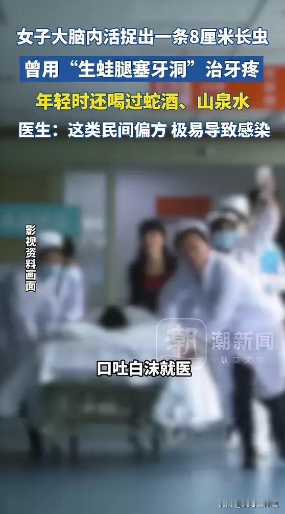 “太吓人了!”广东梅州,一女子因为牙痛,竟用生的青蛙腿塞牙洞,“钓牙虫”来缓解症状,并且还喝过蛇酒、山泉水等,结果突发抽搐、口吐白沫,被送到医院后,医生从她那脑内取出活捉出一条8厘米的裂头蚴!网友:这偏方太膈应人了!