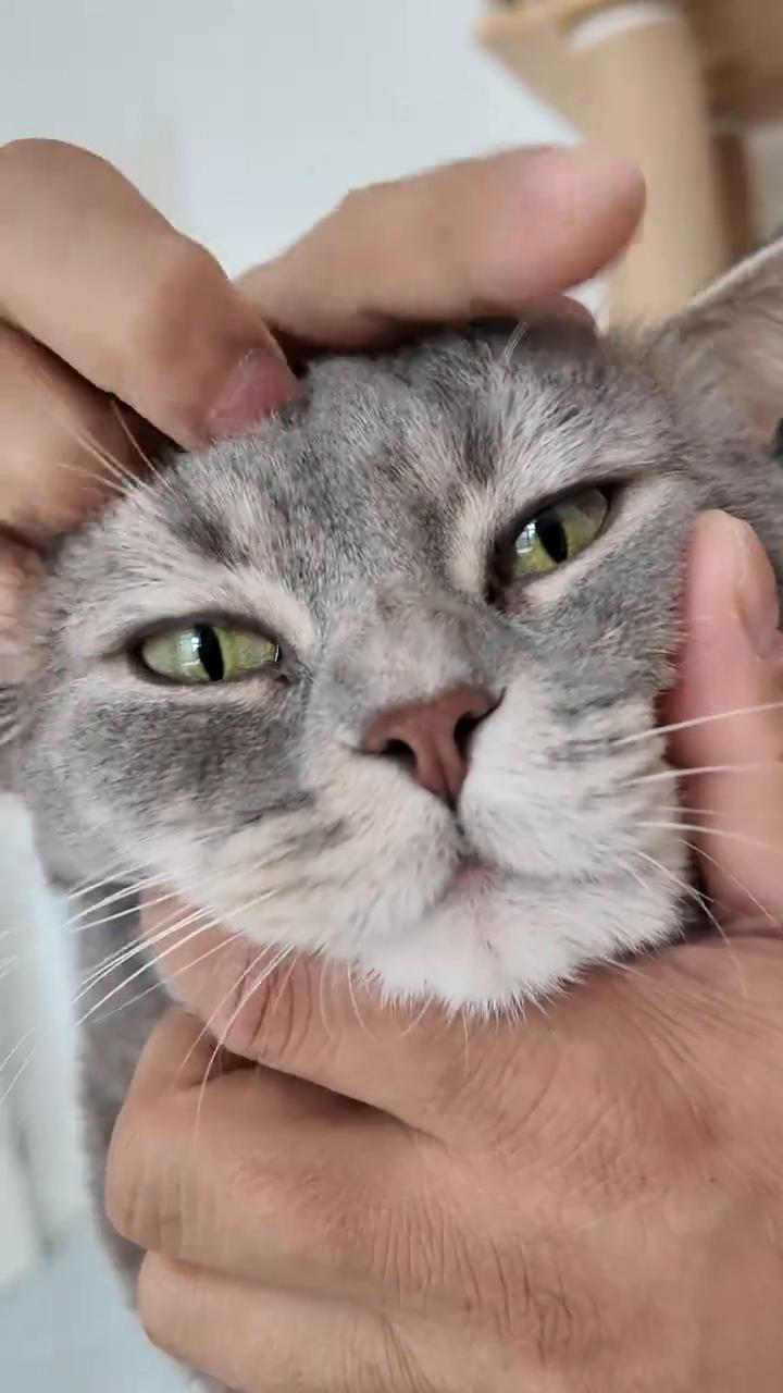 再换一只猫试试,看看灰灰有没有睫毛。灰宝,我看有睫毛没有。看一下,灰宝有没有睫毛。眼泪脏了,都是有黑色的一圈圈睫毛。它和人一样长的胡子,眉毛大长眉毛,还有睫毛。