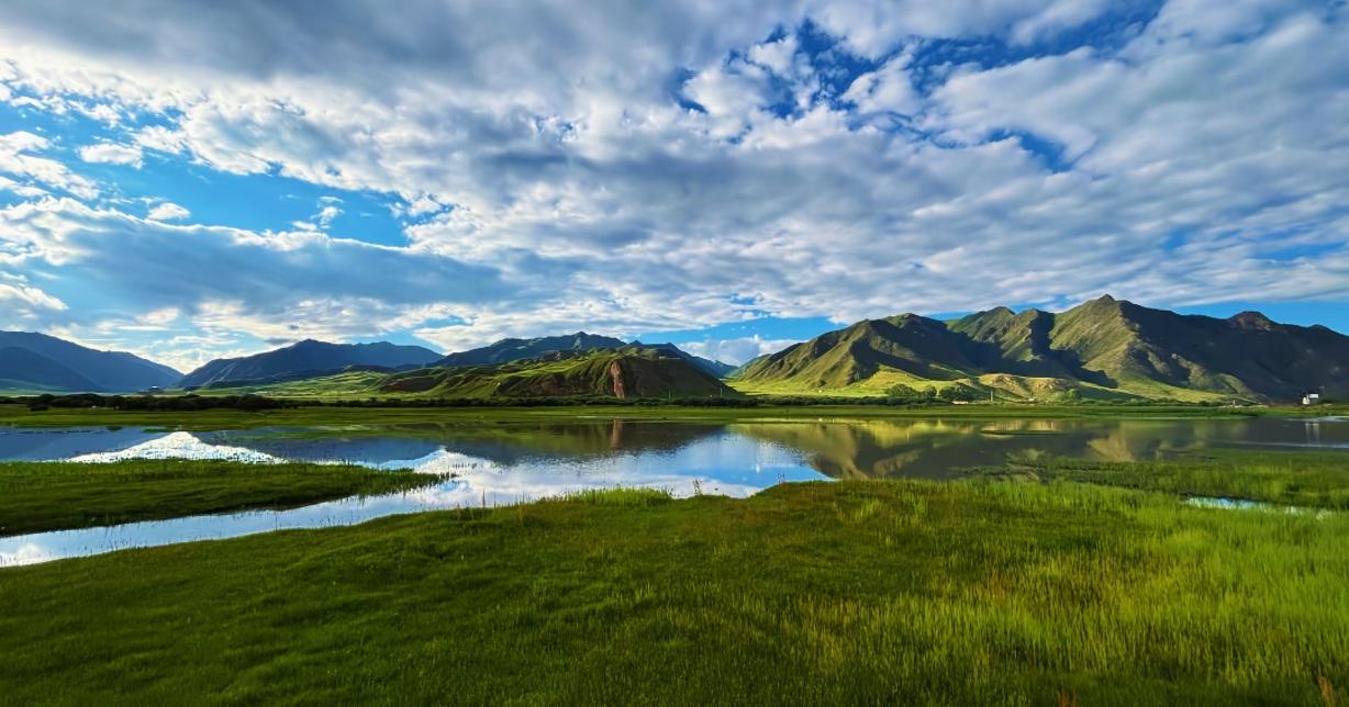 风从远处吹来,带着青草的淡香,拂过脸颊温柔又清爽。抬头是触手可及的云朵,低低地悬在头顶,阳光透过云隙洒下来,在草原上投下斑驳的光影,美得像一幅流动的油画。