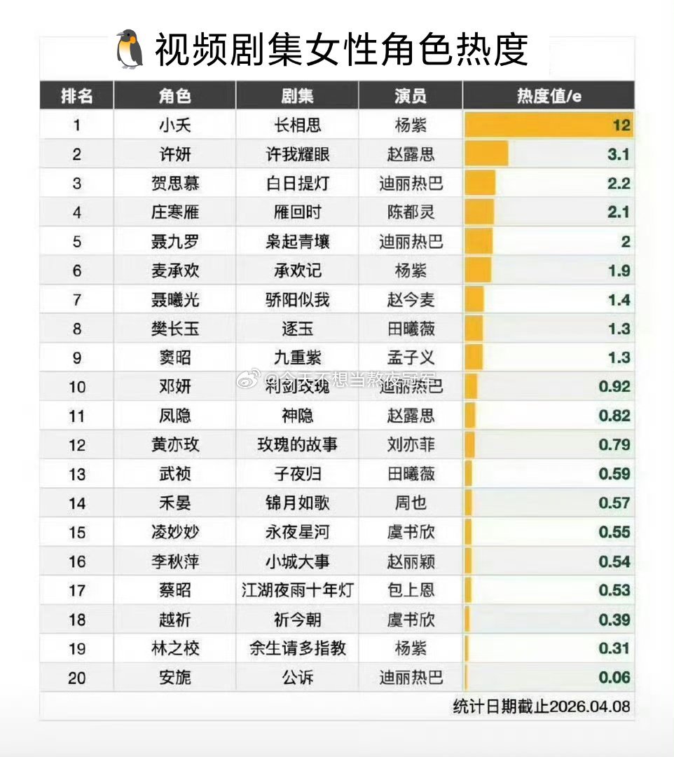 好多人都在争这个🐧女性角色热度,破3亿的只有:杨紫,迪丽热巴,赵露思。