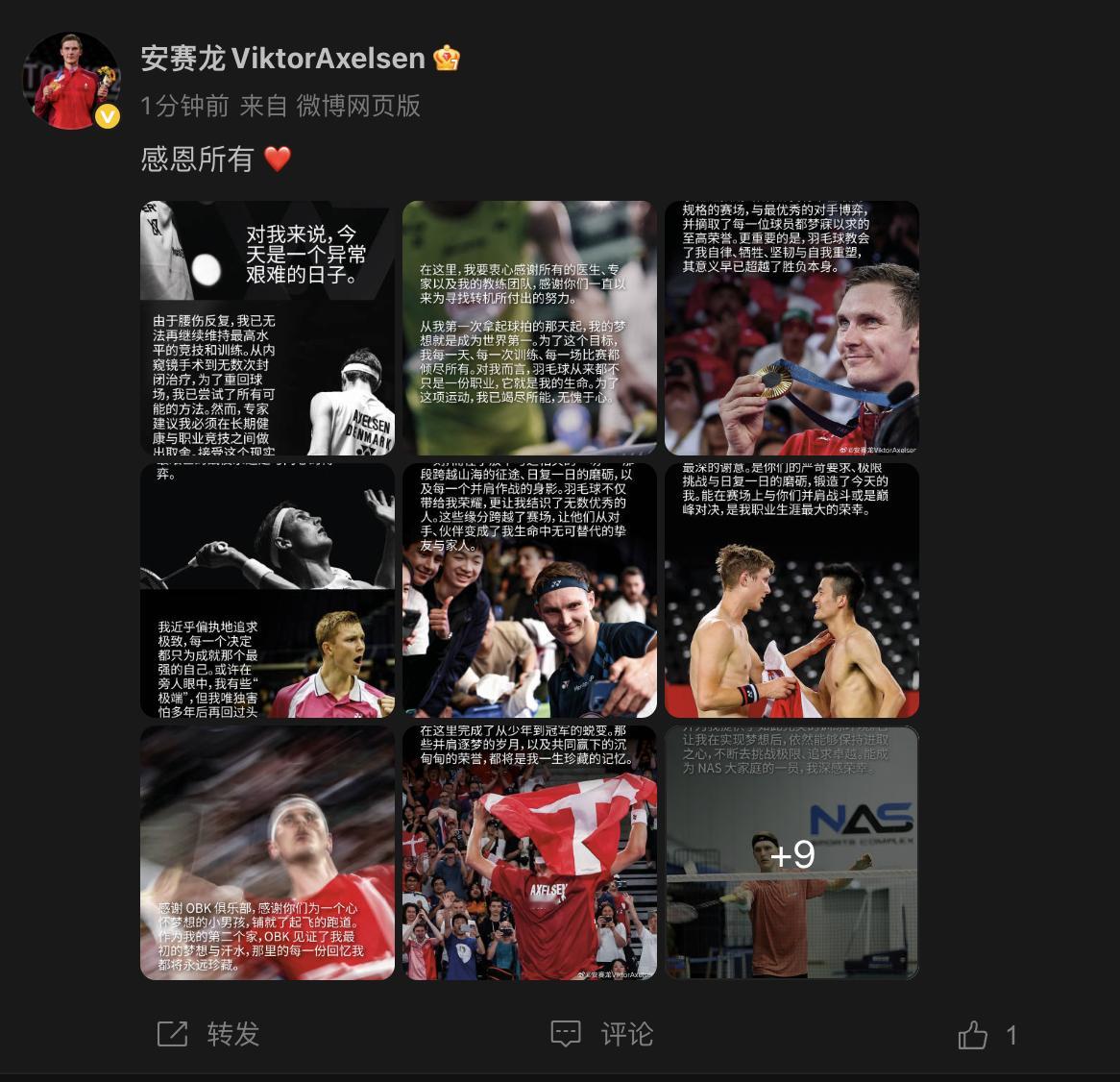安赛龙官宣退役 安赛龙社媒发文:对我来说,今天是一个异常艰难的日子。由于腰伤反复,我已无法再继续维持最高水平的竞技和训练。从内窥镜手术到无数次封闭治疗,为了重回球场,我已尝试了所有可能的方法。然而,专家建议我必须在长期健康与职业竞技之间做出取舍。接受这个现实对我来说无比艰难,但我的身体发出了最后的信号,它已无法支撑我继续征战。羽毛球