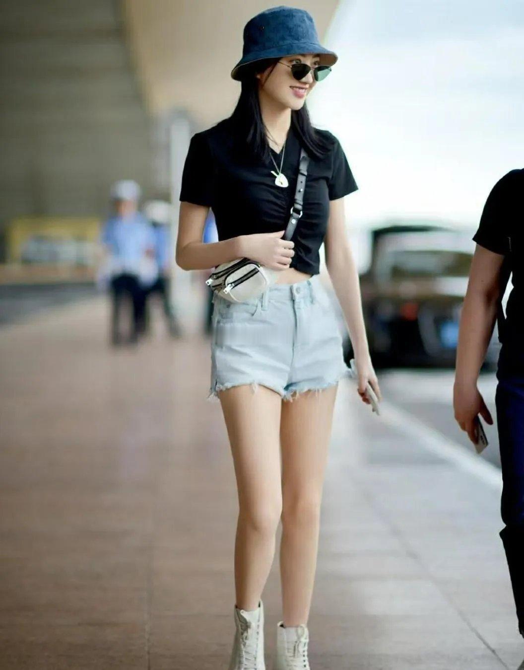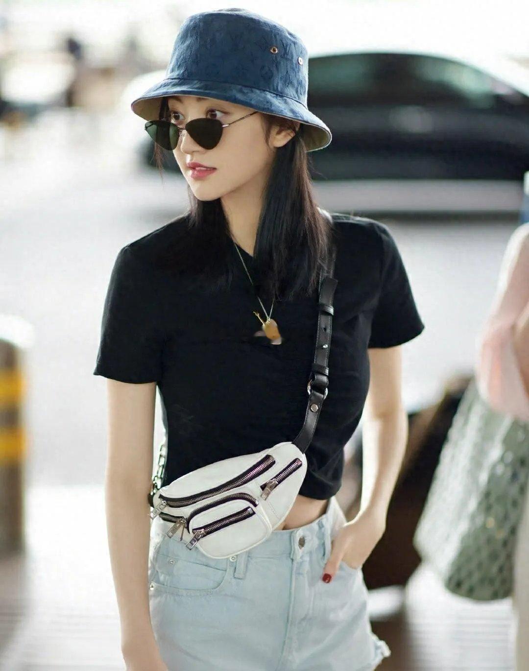 景甜i紧身T完美贴合身形,勾勒出窈窕曲线,牛仔短裤活力四射,大秀修长美腿渔夫帽一