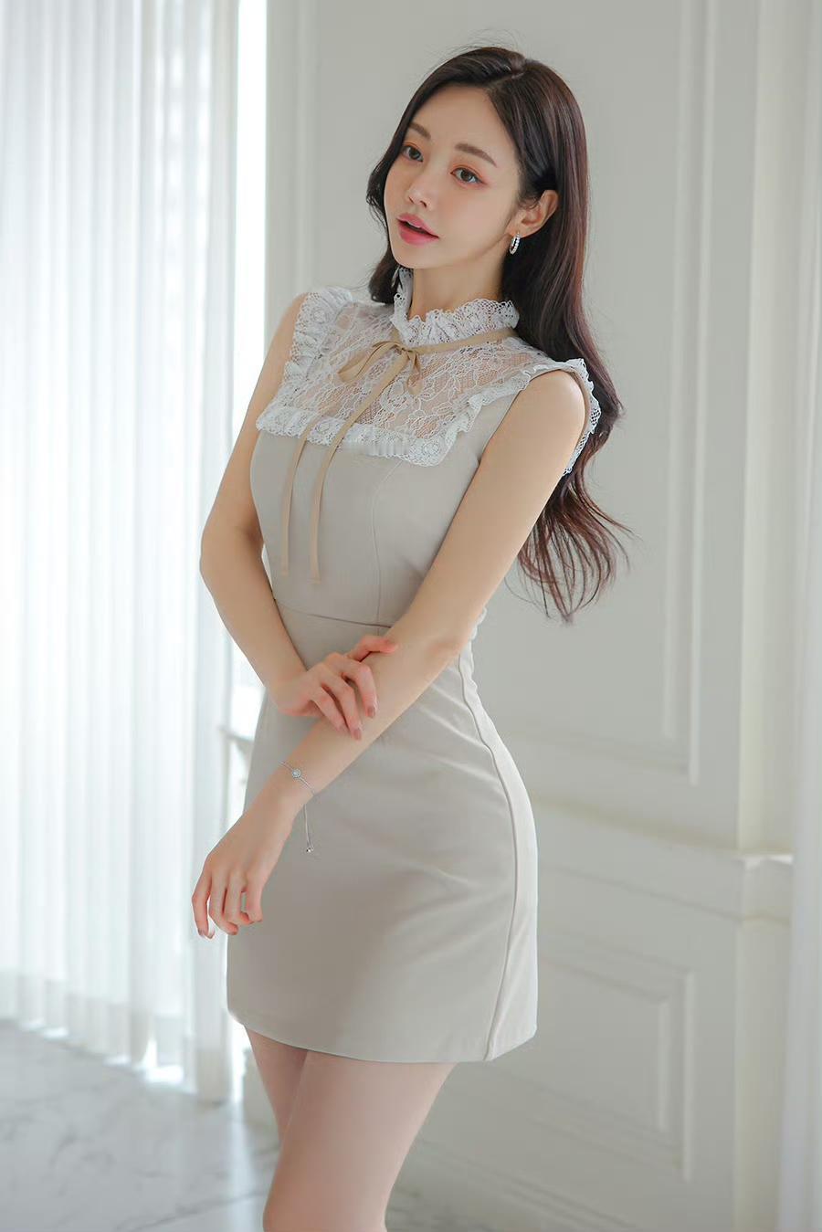 奶杏色的收腰连衣裙自带柔光滤镜,蕾丝立领和小飞袖的设计,又纯又欲,完全不会显俗。腰间的收腰剪裁超绝,把腰臀比修饰得刚刚好,短款的裙长也很得体,又带点小女人的娇俏感。