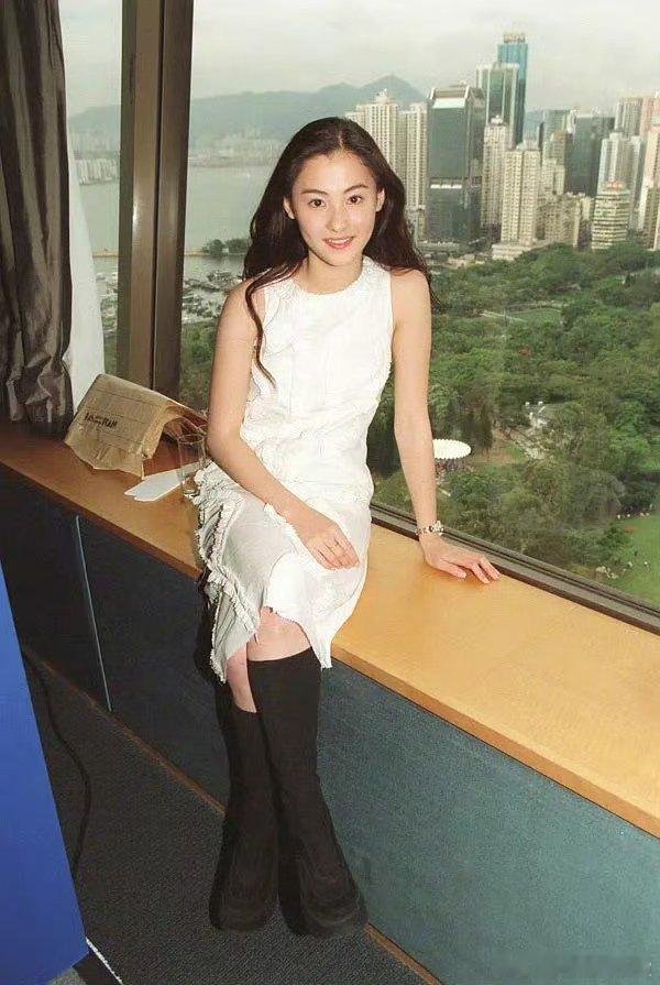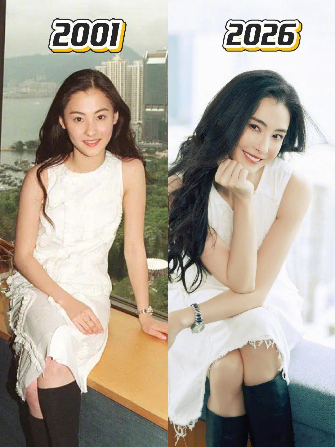 张柏芝19岁vs45岁 对比张柏芝19岁和45岁的同角度照片,同款白裙同款场景,
