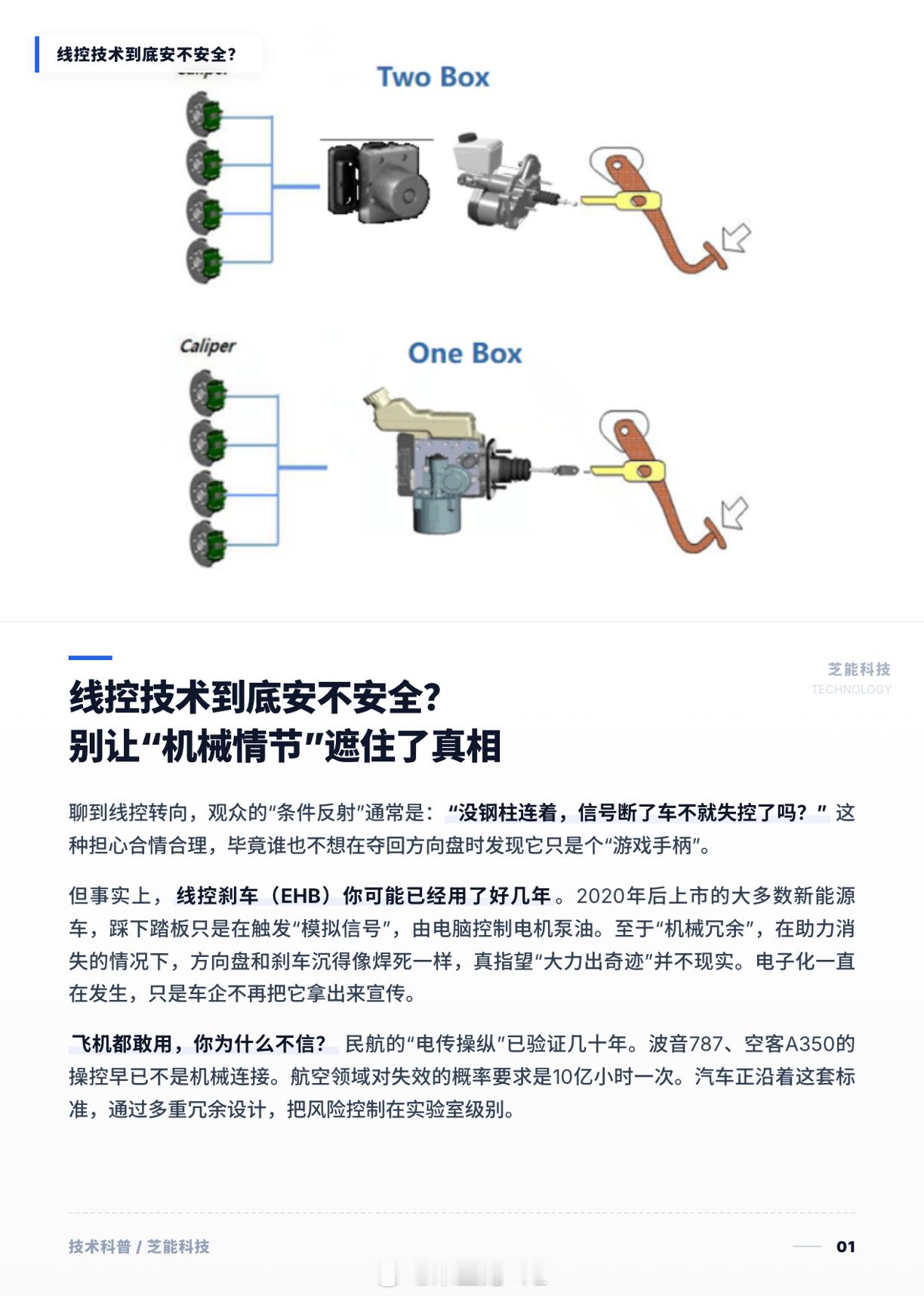 实际上在新能源汽车里面,为了续航,我们大量采用了 EHB 电子液压制动方案,这种带有“线控”的刹车,我们一直在用。2020年以后上市的车型,绝大多数搭载的是One-Box或Two-Box线控刹车系统,你脚踩踏板的动作,只是按了一个"踏板模拟",信号传给行车电脑,电脑再控制电机泵油完成制动。这套系统,我们每天在用,也是由全球主要的Tier1 来做,安全性验证到了大规模量产的水平。只是车企因为这套都在用,已经不拿它来宣传了。