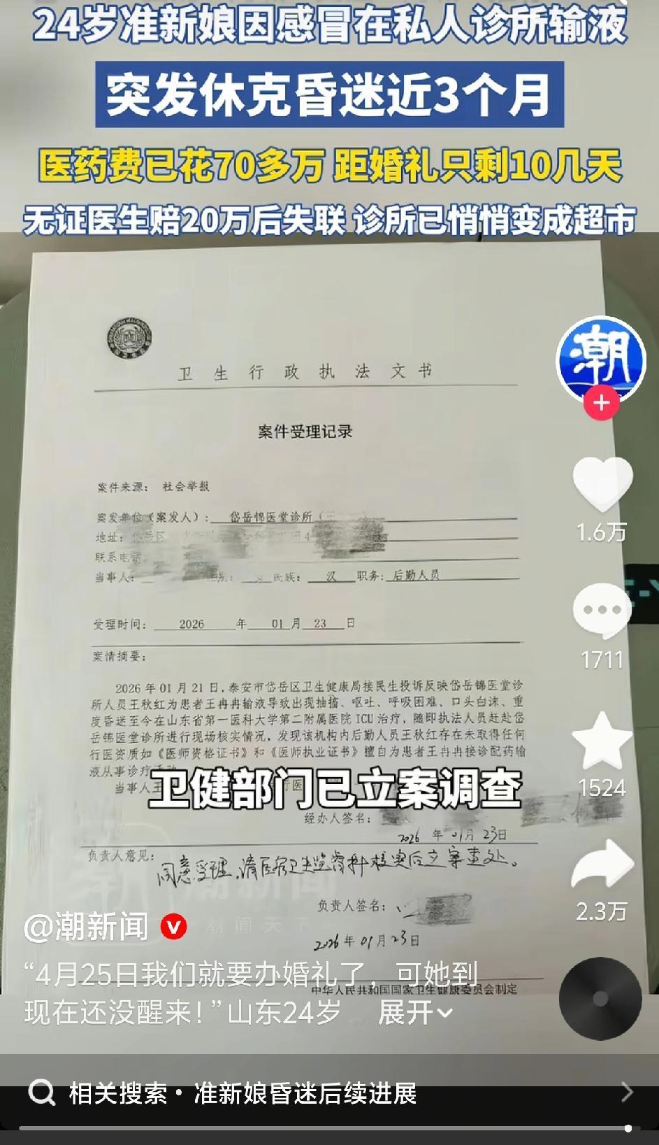 参考信息:24岁准新娘因小感冒在私人诊所输液,突发休克昏迷近3个月未醒,距婚礼只剩十几天。涉事诊所已变生鲜超市,无证医生赔了20万元后失联 2026-04-1411:09·九派健康