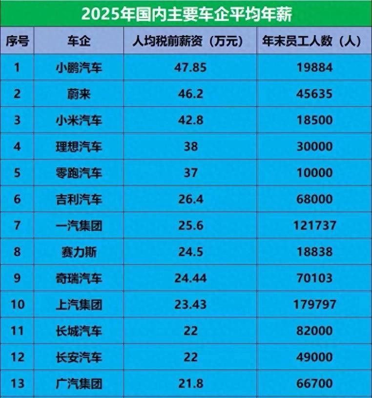 再看传统车企,吉利26.4万、一汽25.61万、上汽23.43万,基本都在20到27万之间。这些企业员工多、摊子大,薪酬体系成熟但也没那么灵活。它们2026年的销量目标只敢定13%左右的增长,步子迈得更稳。