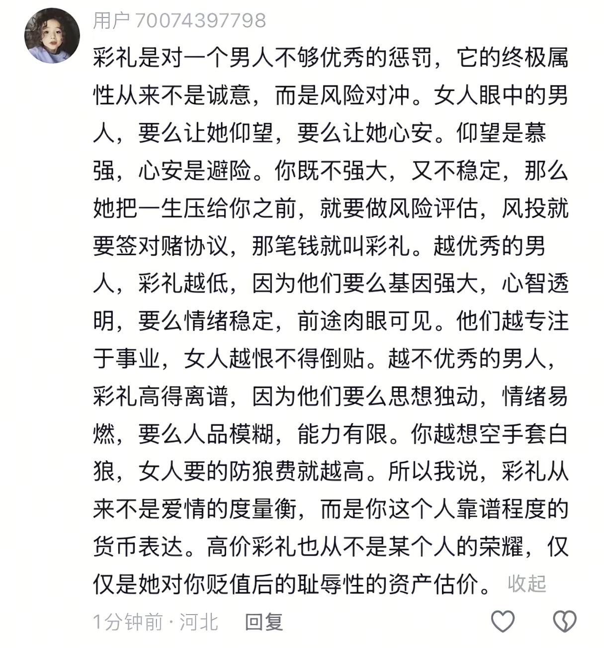 我是支持这个女士的,主打一个真实,有实力,彩礼也不多。