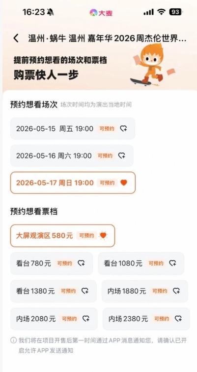 周杰伦蜗牛·温州嘉年华演唱会,近日在大麦APP、猫眼APP悄然上架,票价580元到2380元不等。值得注意的是,此次新增了大屏观演区,票价为580元,引发网友热议。