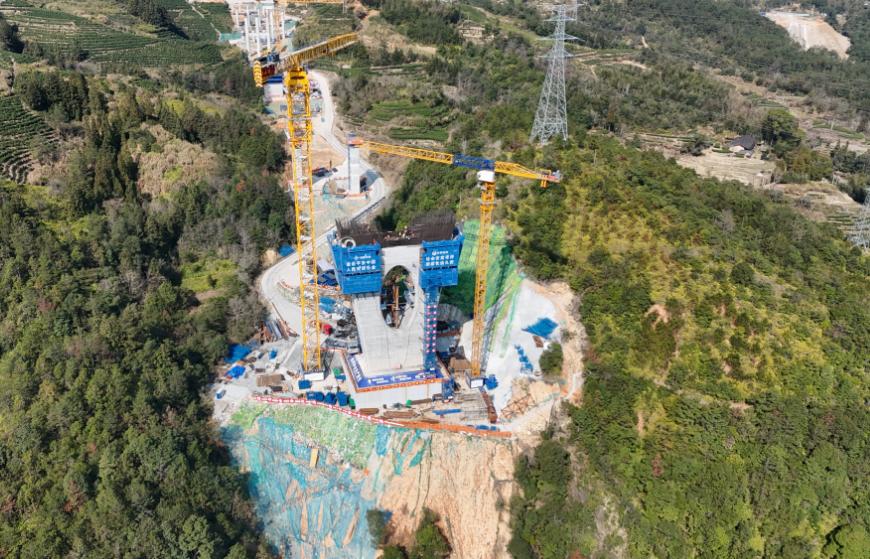施工现场,两座高达141.5米的主塔巍然矗立于崇山峻岭之间,成为山谷中醒目的地标。目前,Z1塔柱已完成第五节段混凝土浇筑,Z2塔柱进展更快,已完成第十节段砼施工。两座塔柱步步“朝天走”,每塔共分33个节段,混凝土逐日攀升,施工节奏明显加快。