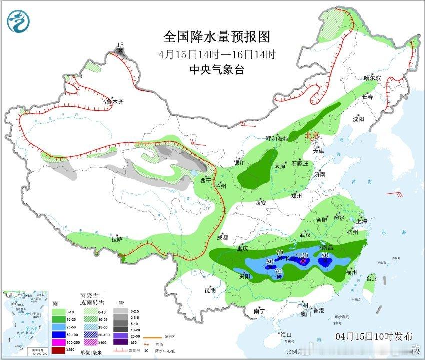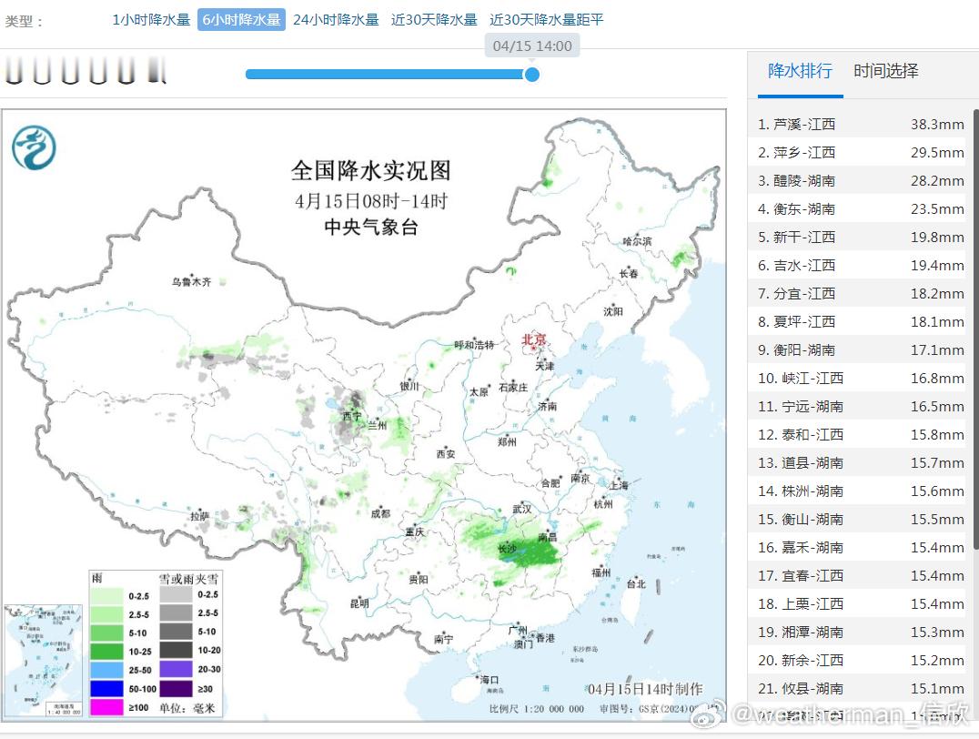今天中央气象台继续发布暴雨蓝色预警:预计,4月15日14时至16日14时,贵州中东部、湖南中部和西部、江西中部、福建西北部、广西东北部等地部分地区有大到暴雨,其中,湖南中部、江西中部等地局地有大暴雨(100~120毫米)。此外,北方地区今明也有高空槽东移,导致西北地区东部到华北一带的降雨增多。
