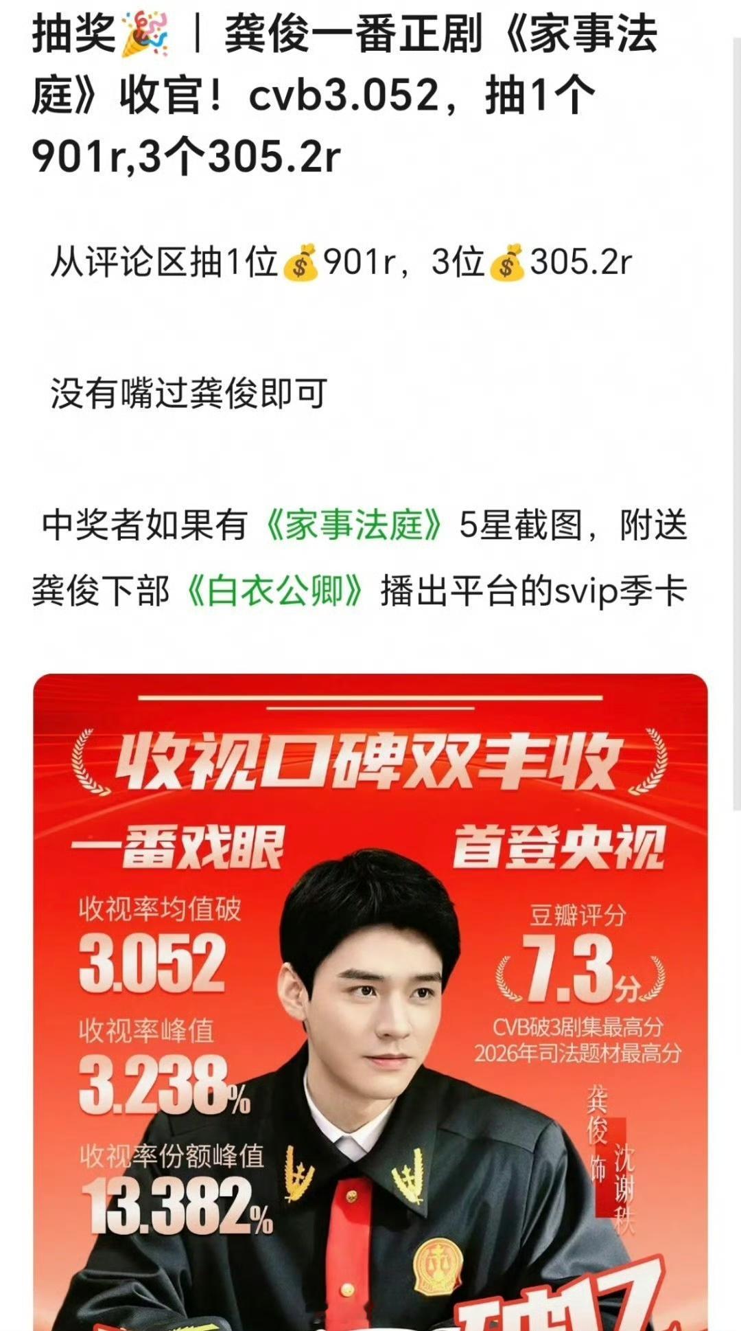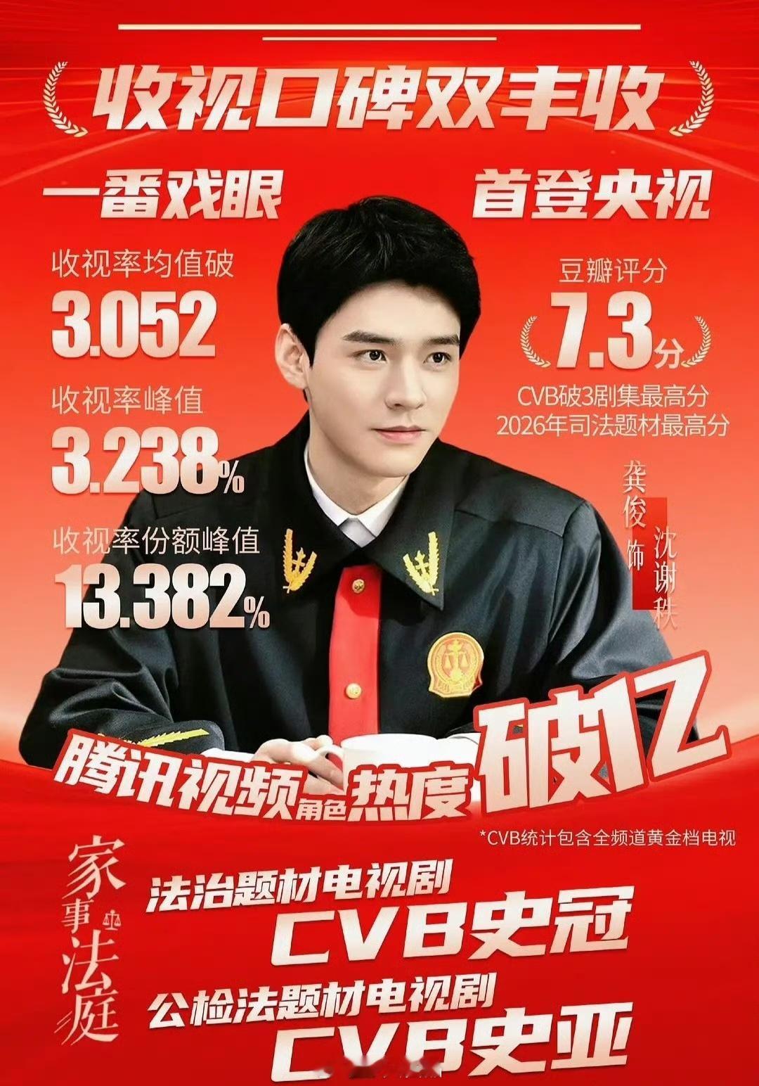 龚俊一番正剧《家事法庭》CVB集均3.05290生首位且唯一,一番实绩和演技口碑美美拿下,恭喜龚俊家事法庭