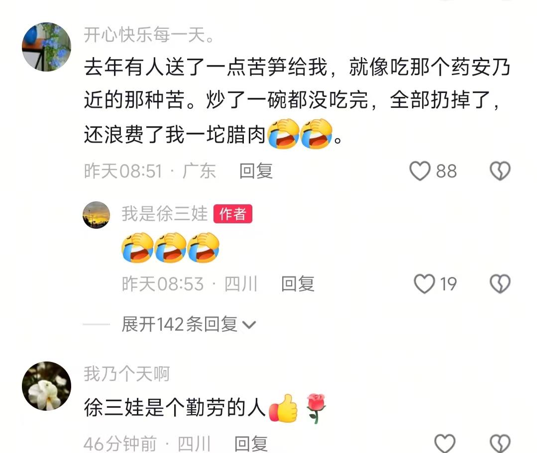 我晕!今天摸鱼刷徐三娃的视频,本来只想看个农村日常打发时间,结果点进评论区直接看傻了。就因为他挖了两筐苦笋去集市卖,有人骂浪费腊肉,有人求着要链接,吵得那叫一个凶,我愣是翻了半小时评论没出来。