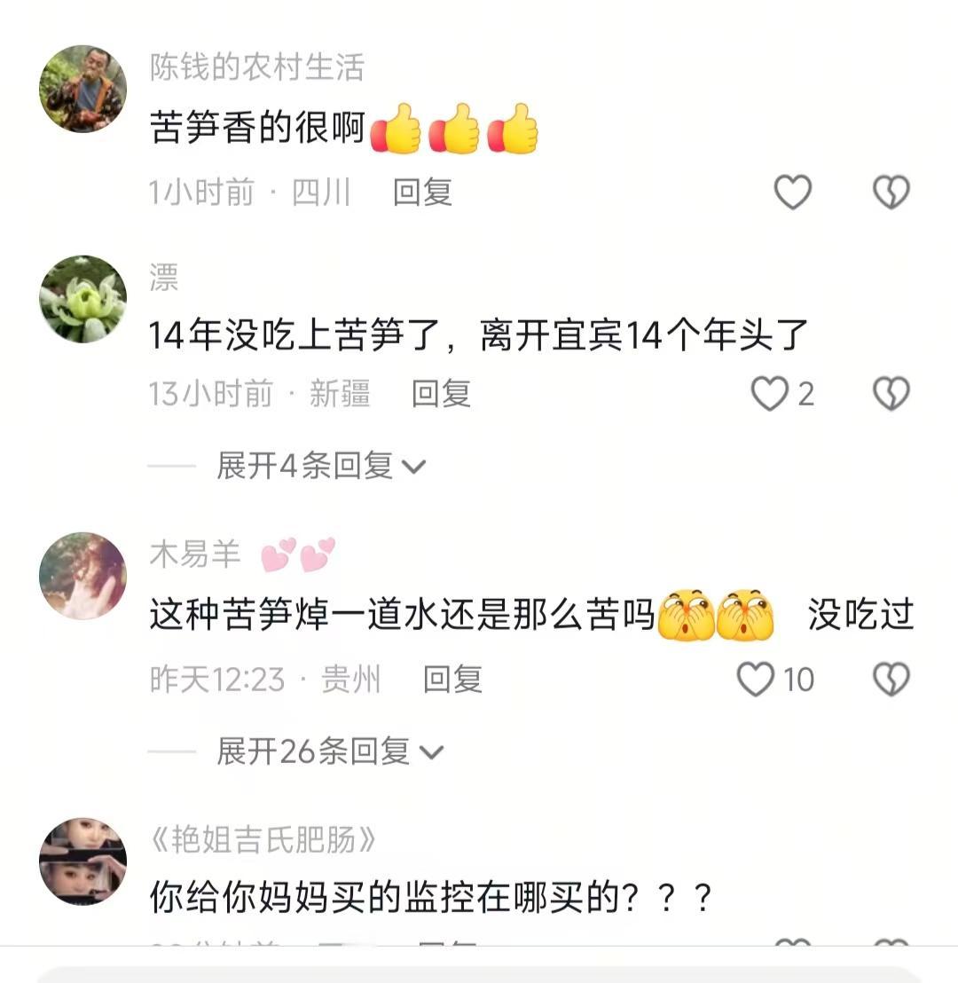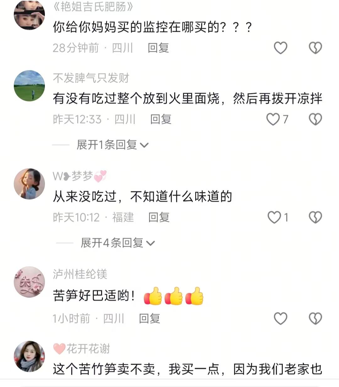 但是又怎样,总有人爱这一口爱到骨子里。评论区好多人追着求链接,有个泸州网友说,家里老人年纪大了走不动,好几年没回泸州了,就想吃这口家乡味,多少钱都愿意买。还有人说别的笋子都不爱,就爱这个苦笋,晒成笋干炖肉更是巴适,可惜在外地打工根本吃不到。甚至有人说邮费自己出,路上烂了都不用负责,这执念也是没谁了。