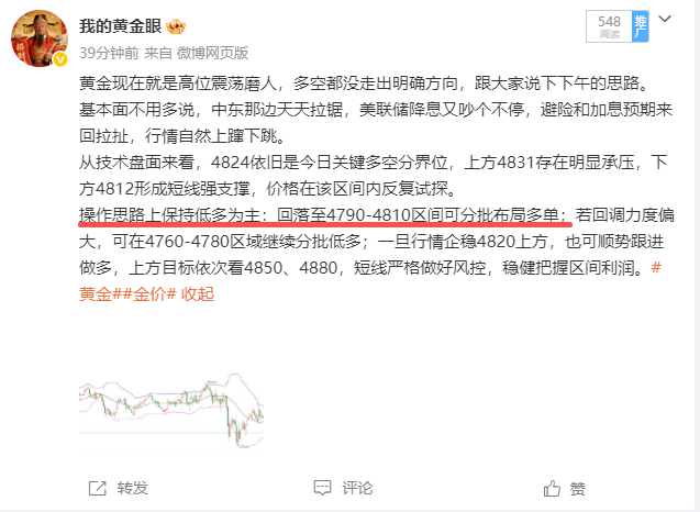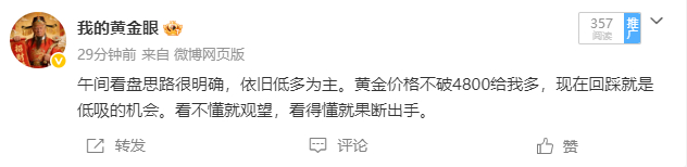 一直在抓低多的空隙,刚那行情走得太快了没来得及通知大家入场,但早就已经在博文跟大家说过今天的做单思路了。来不及遗憾惋惜已经走过的行情,还有下一波的行情在等着咱们,咱们不必追求每一单都能上车,依旧是先求稳,再谋利。黄金金价