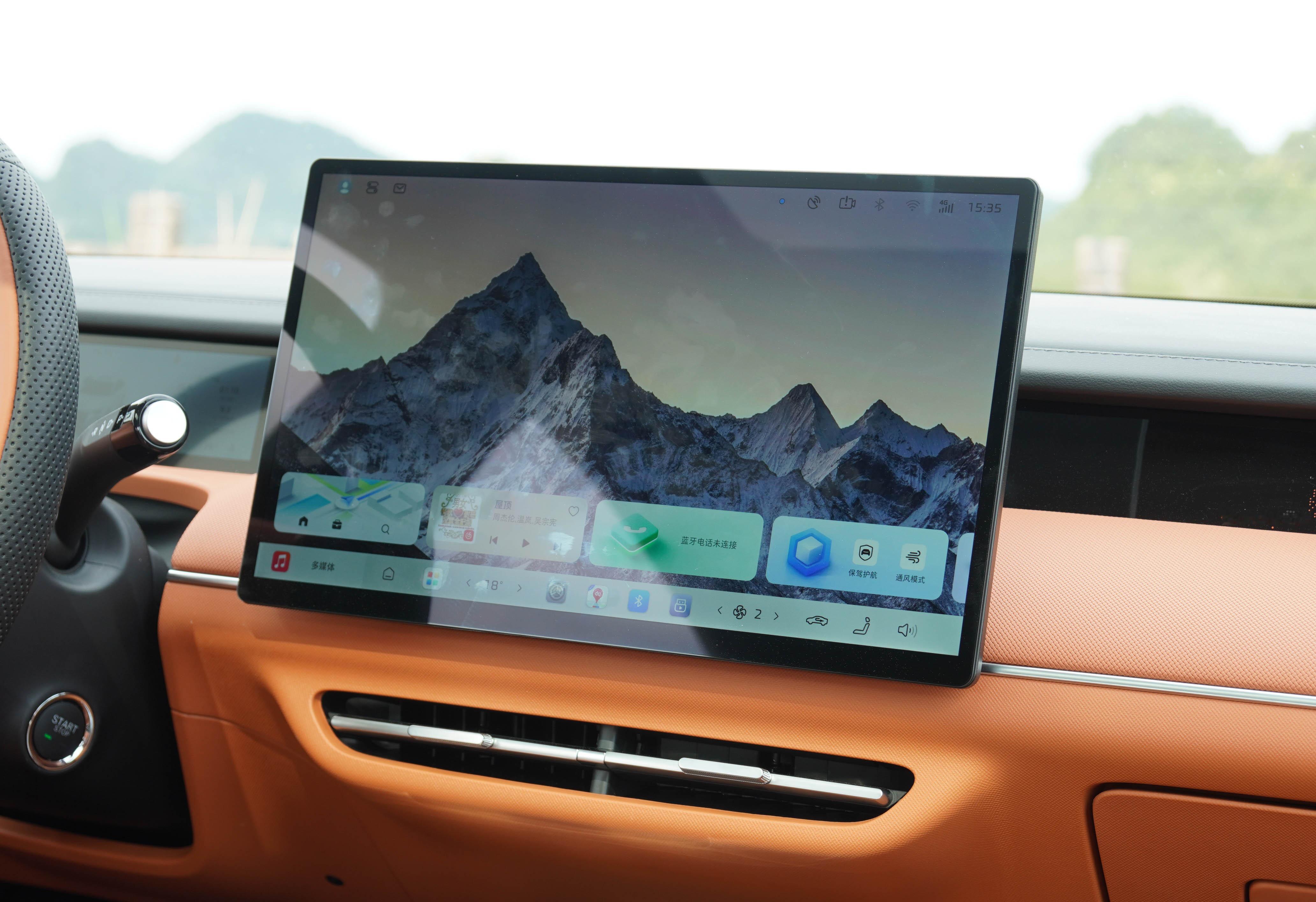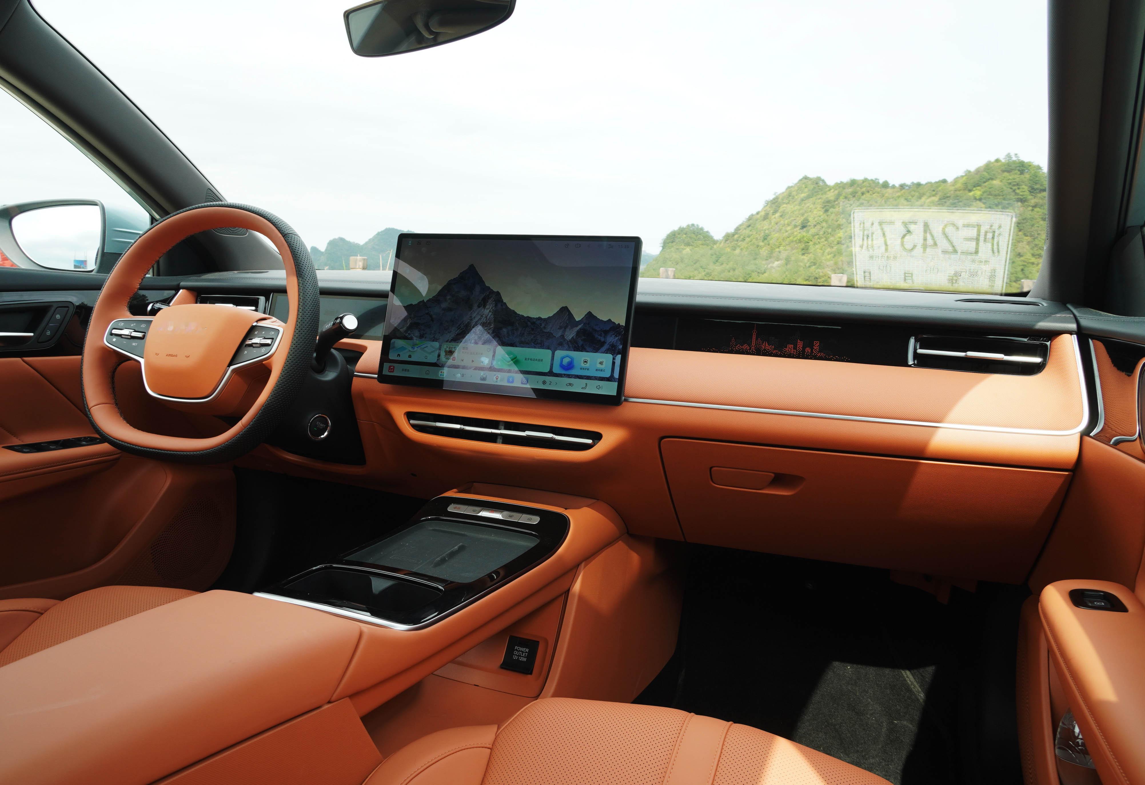3、【豪华内饰】简约的内饰风格,一块大屏幕+少量物理按键,看上去就很清爽。你随手可以摸到的地方基本都使用了软包设计,据官方资料,这台车的内饰软包面积9.86㎡,覆盖率达到了75.49%,作为一台家用车来说,这是不是有点超纲儿了?