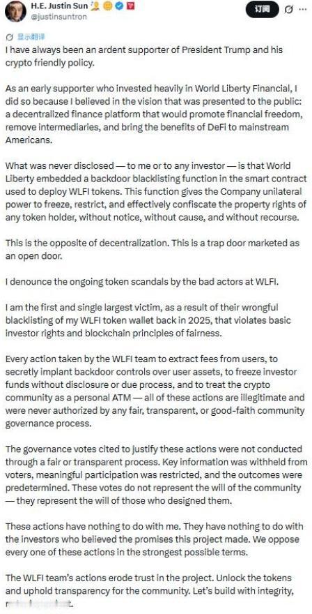 4月12日,币圈“地表最强90后”孙宇晨,突然在X平台发出悲愤控诉——他重金押注的特朗普家族DeFi项目WLFI,竟暗藏致命后门,近9亿美元资产被无故冻结,如今币价崩盘、血本无归。