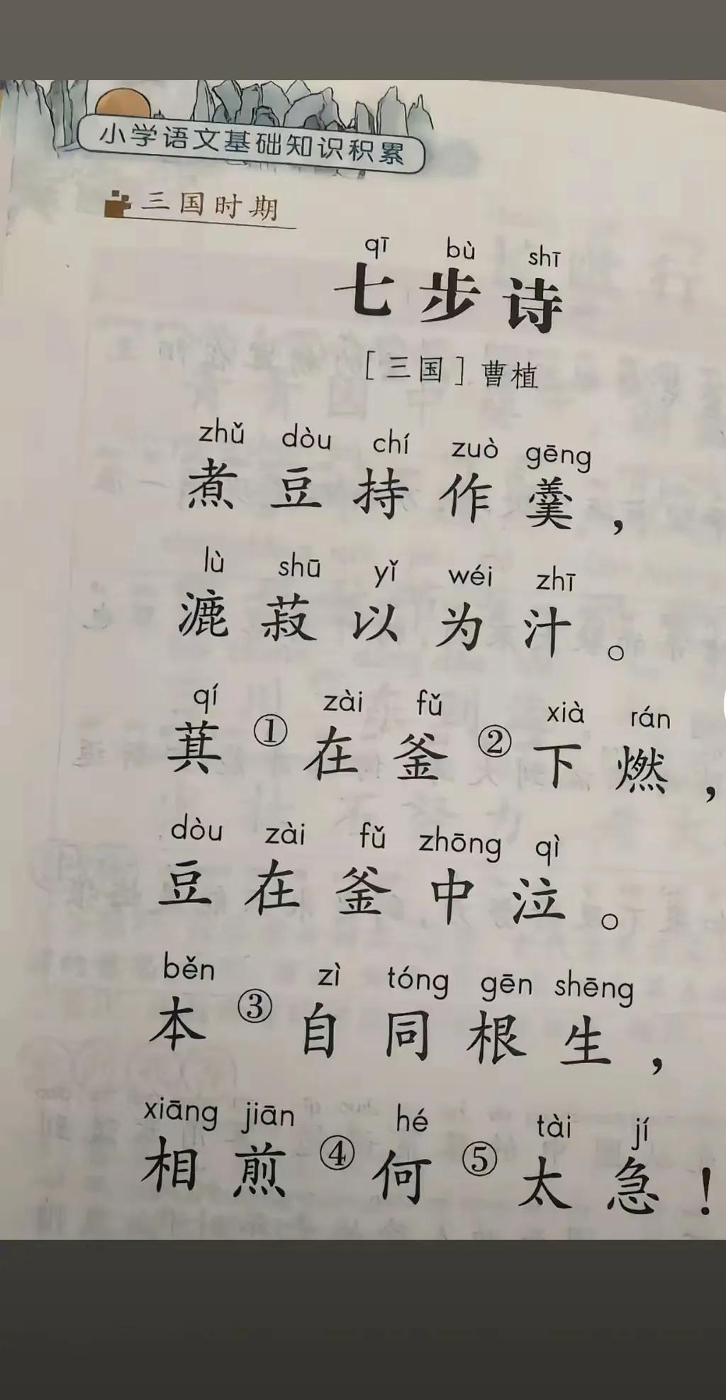 上世纪七十年代,我们读曹植的七步诗长这个样子:四句为“煮豆燃豆萁,豆在釜中泣。本是同根生,相煎何太急?
