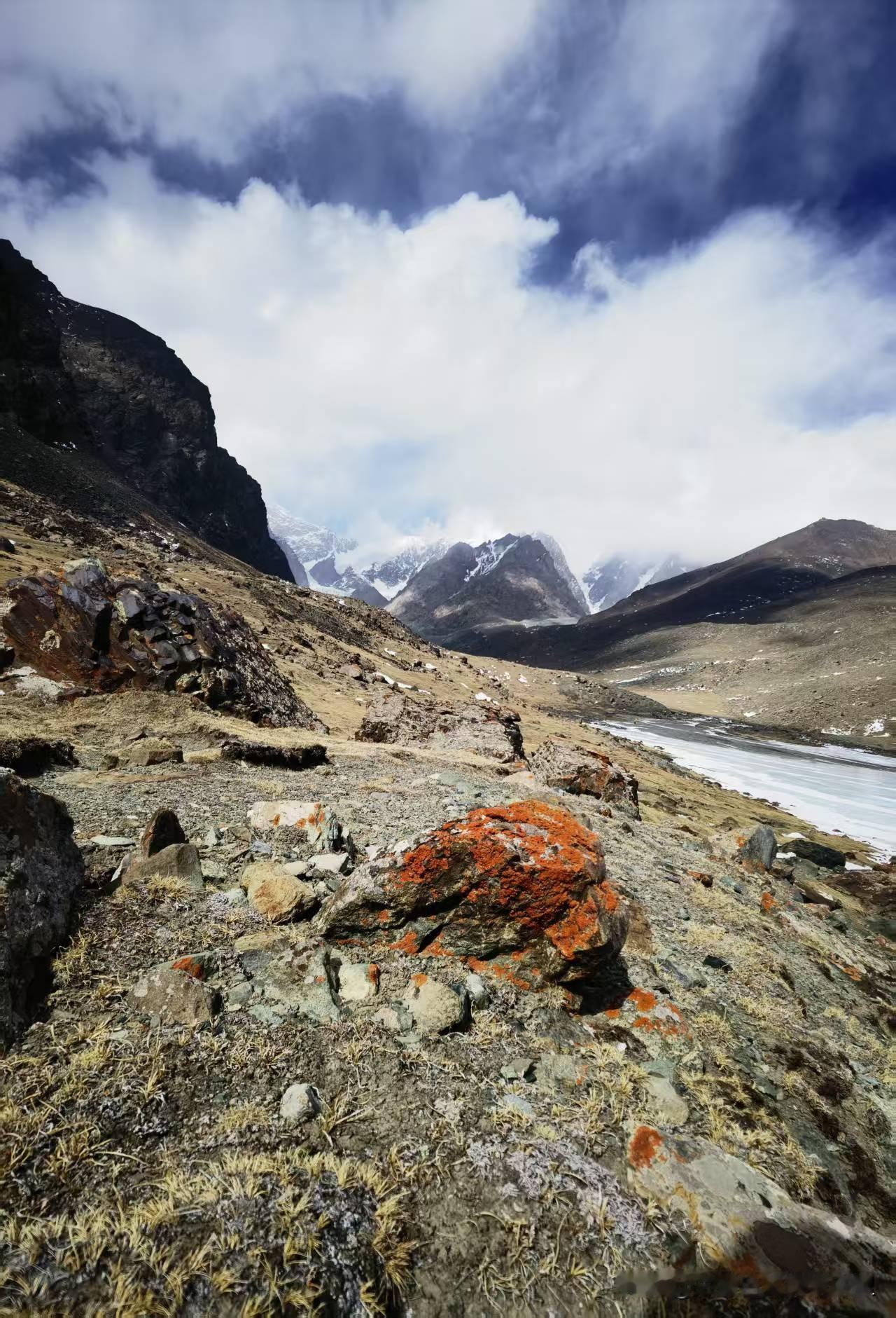 我带着部分队友只到达冰湖看了看,已经很美了,看着冰川就在不远处,高海拔的云雾就是白,云层忽上忽下的,眼看着在山脉中快速飘动,我坐在冰湖边,航拍一会就冻的手麻木了,山里的风还是挺冷的,把无人机飞到冰川跟前,就失去信号了。我们在冰湖边呆了很久了,一是等待大家,一是想多看看这里的美景。