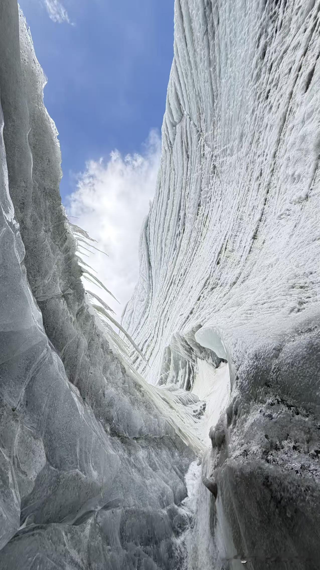再聚冰塔林,赶在化雪的最后时期,去看冰川,这里也是离乌鲁木齐最近的冰川了,每年都会去几次这里,每一次去都会有不同的感受,遇到云雾天气就更美,夏季还去这里露营过,记得哪年的夏季正好赶上十五,夜里的月光和白昼一样,也遇到伸手不见五指的夜晚,差点在那天夜里迷路,这就是大山的神秘莫测,有美丽同样有危险。