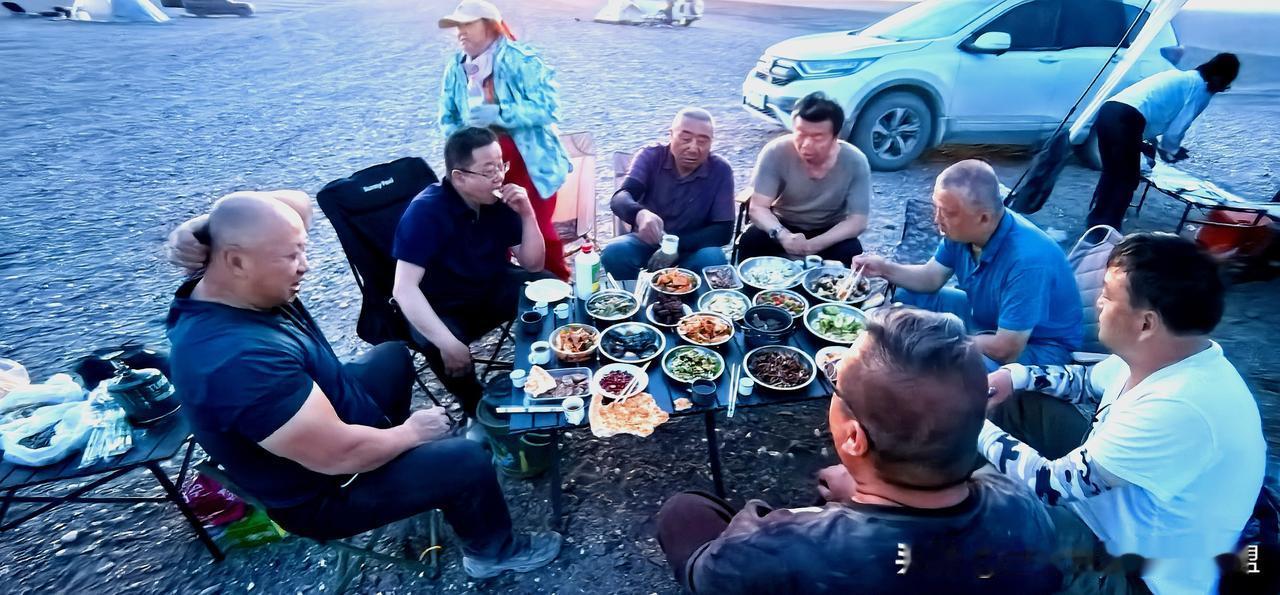一天的风尘满车都是土,先把能擦洗的擦洗干净,收拾好床铺,老同志拿来西瓜,在这沙漠能吃上就是奢侈,收拾干净了开始做晚饭,露营的夜晚是体现大家厨艺的时候,我们几个车一起做饭,每个车做几个,拼到一起就是20个大菜,丰富又美味,大约9点开始吃饭,此时夕阳的红艳铺满整个沙漠,那一片阳光只有在无人区能看到,大家惊呼着拍晚霞,拍完我们开始吃饭,首先大家一起干一杯,看着人人堆满笑容和开心的脸,此时此刻大家都是幸福的,此时也真饿了开始吃饭,男人们边吃边喝,喝了酒个个都是话蒌子。