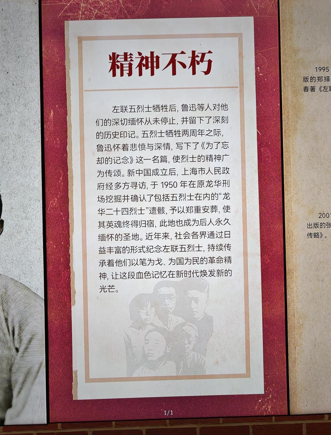 上海四川北路公园里的“中共四大展览馆”内有名为“我以我血荐轩辕”的展厅,主要是左联五烈士的事迹与图片展,观后觉得,对于一个语文老师来说,这些史料与图片,很直观,印象很深刻。在网络上介绍中共四大展馆内容的同时,如果也能简明扼要说明这里也有关于左联五烈士的事迹展的话,相信到此馆参观的人会更多,尤其是青年学生。