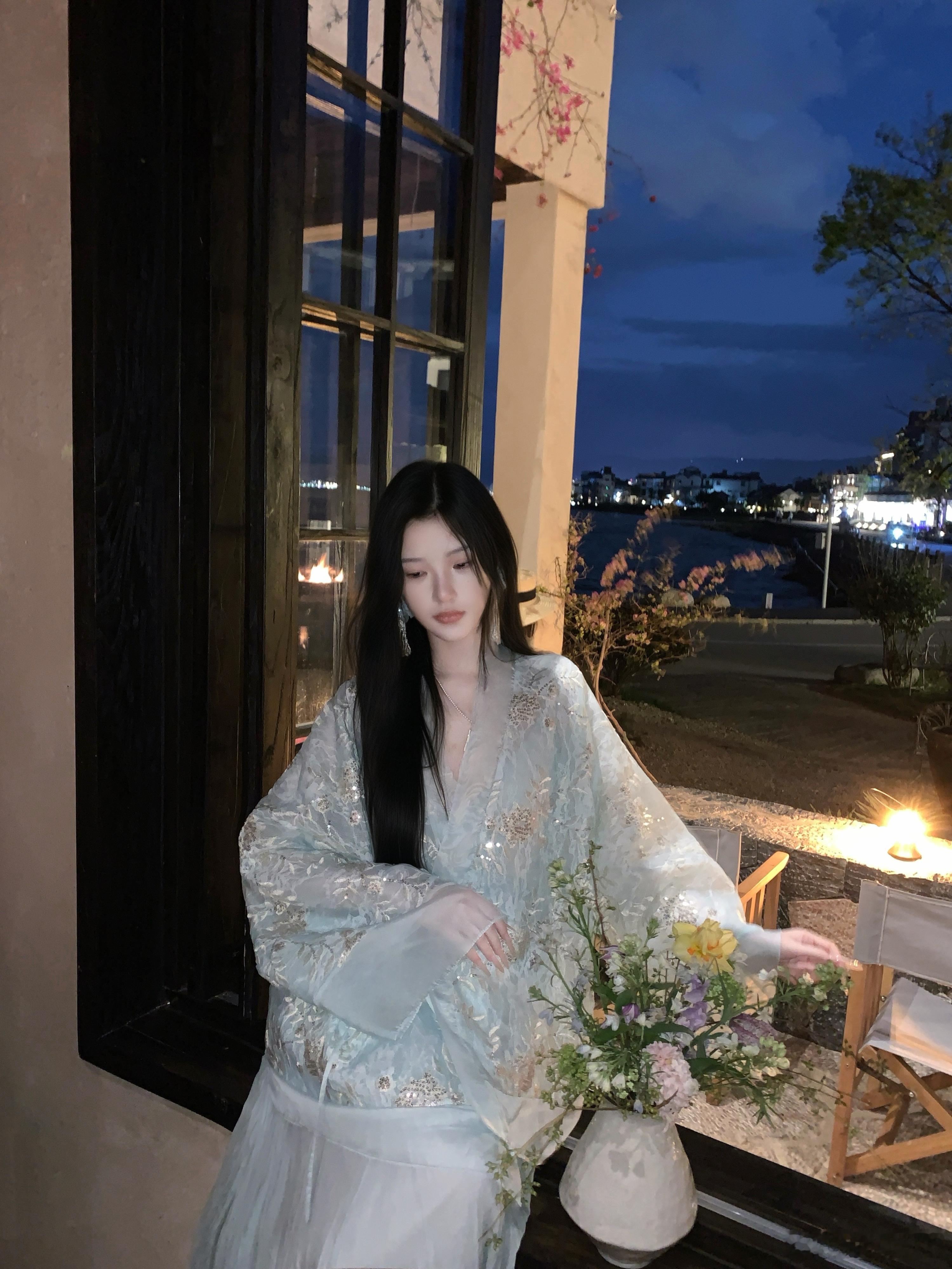 𝑴𝑶𝑺𝑺 𝟒.𝟏𝟓/𝟐𝟎:𝟎𝟎𝒑𝒎【瑶光织影】💫💫新中式原创重工亮片绣花外套衣身甄选西子蓝这一清新色调🩵自带清冷高级感,宛如将春日湖畔的静谧蓝韵穿在身上,视觉上温柔又显白。设计上采用绣花工艺,细腻的花卉纹样🪡搭配灵动亮片,在光线下流转着细碎而柔和的光泽,低调中尽显精致贵气。宽松的版型剪裁,巧妙包容身形,对各种身材都十分友好;轻盈的镂空设计搭配通透的纱质基底,自带朦胧仙气新中式穿搭