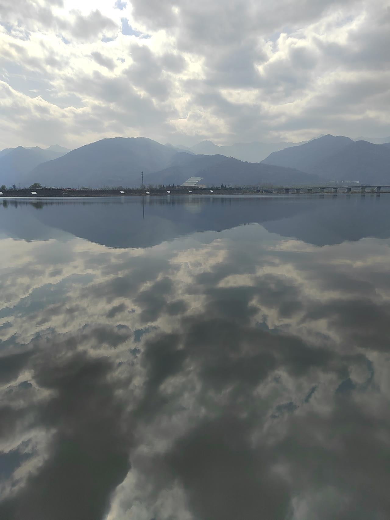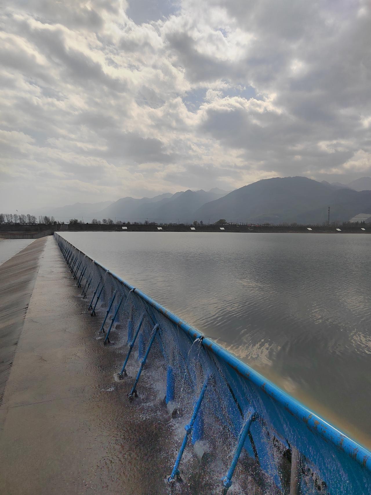 秦岭脚下,周至县马召镇辛口峪黑河水库的拦河坝云水相连,湖光山色,美如仙境。