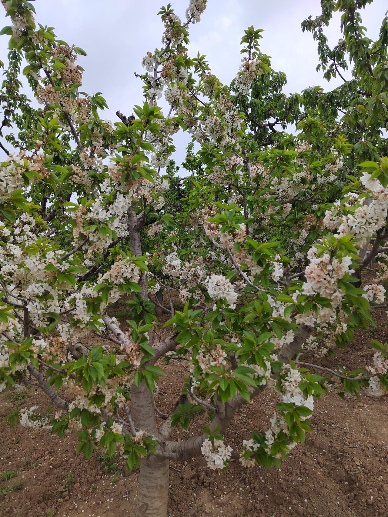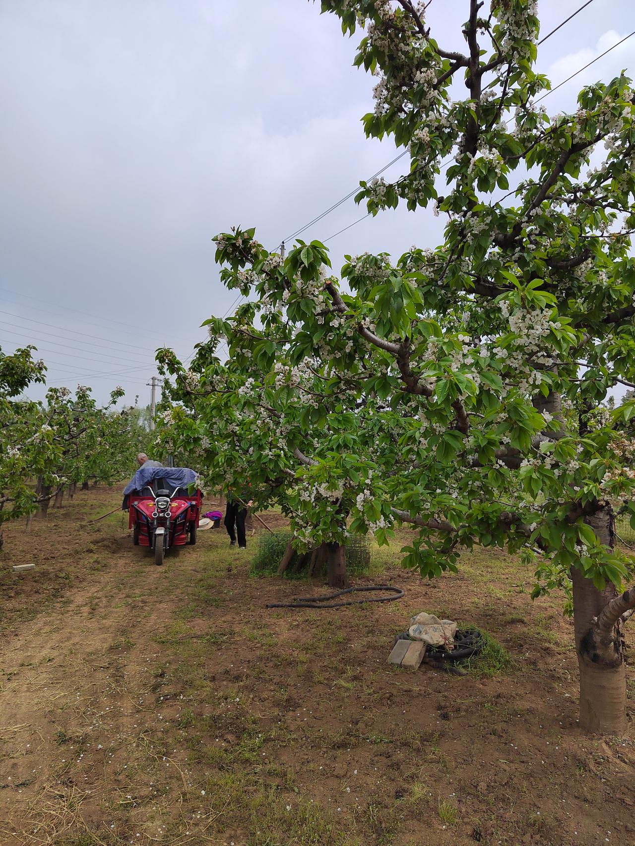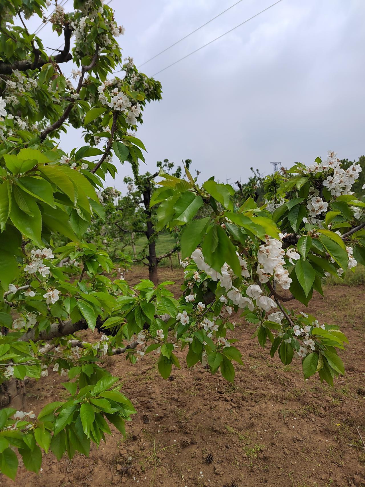 走近白鹿原狄寨附近连绵不断的樱桃园,发现多半已经花落坐果,正是花褪香残樱桃小,已结了豆粒大的果实。也有少量比较晚的品种,簇拥的花朵一树洁白。有果农在树下翻土施肥。旁边大棚里的草莓已经到了最后关头,草莓不太多,但依然在采摘出售。