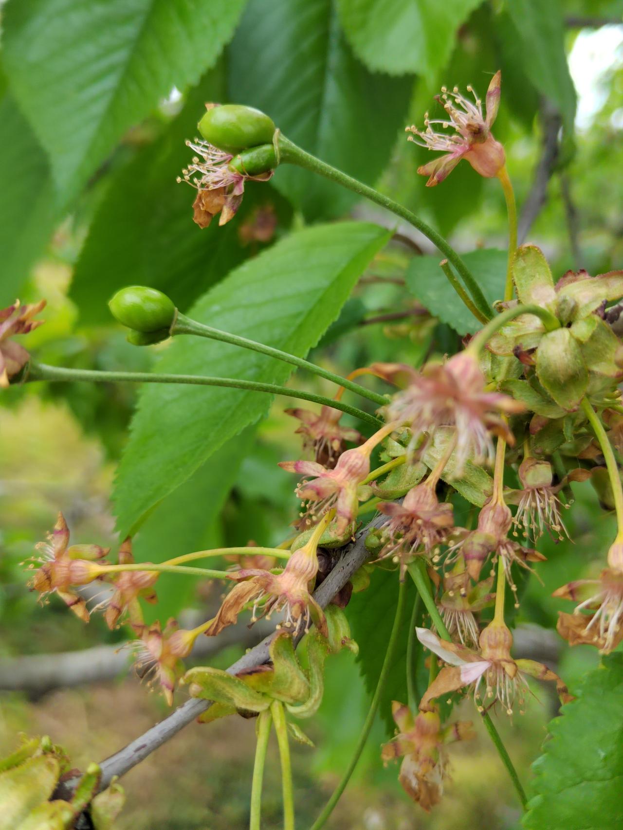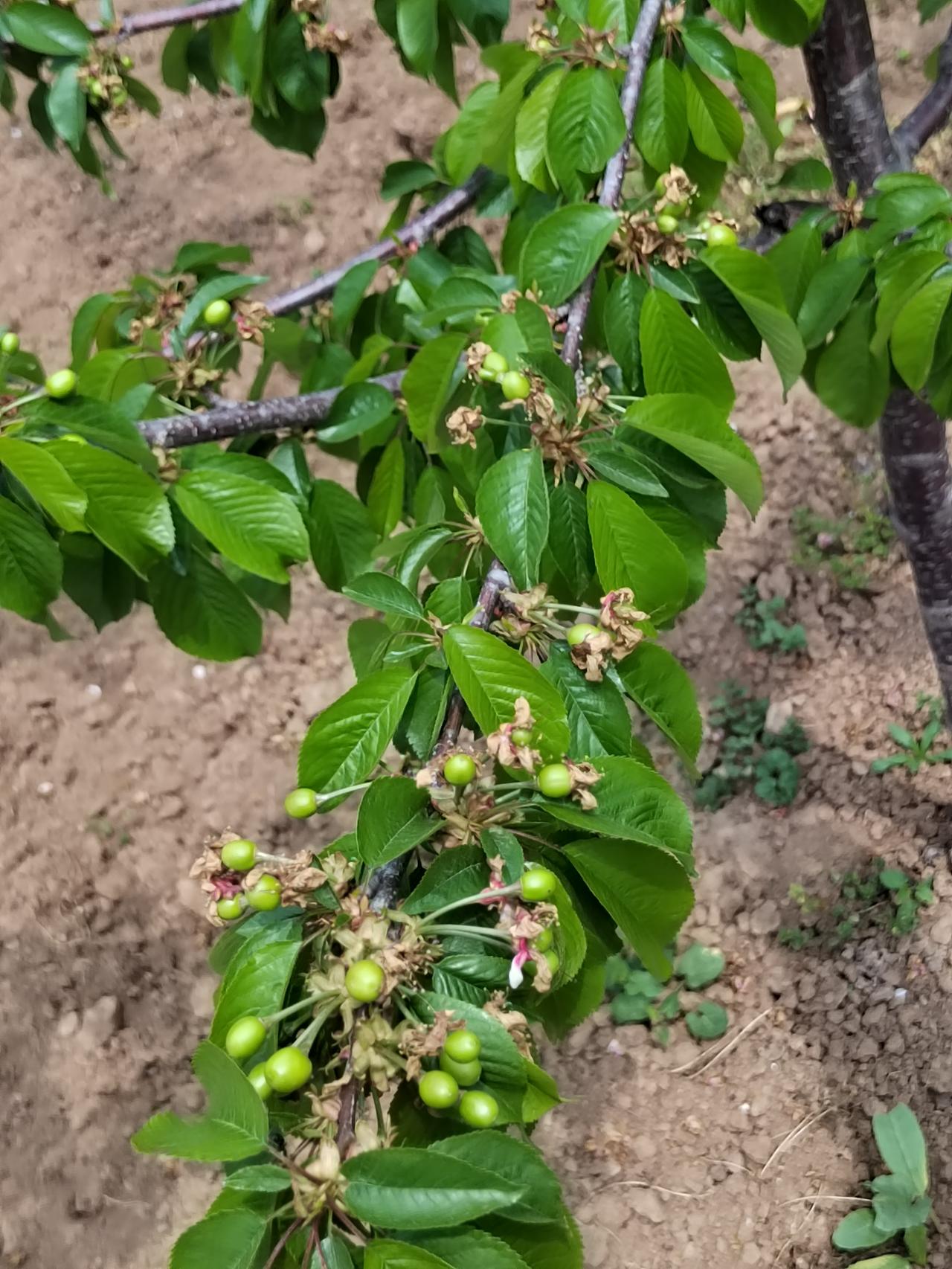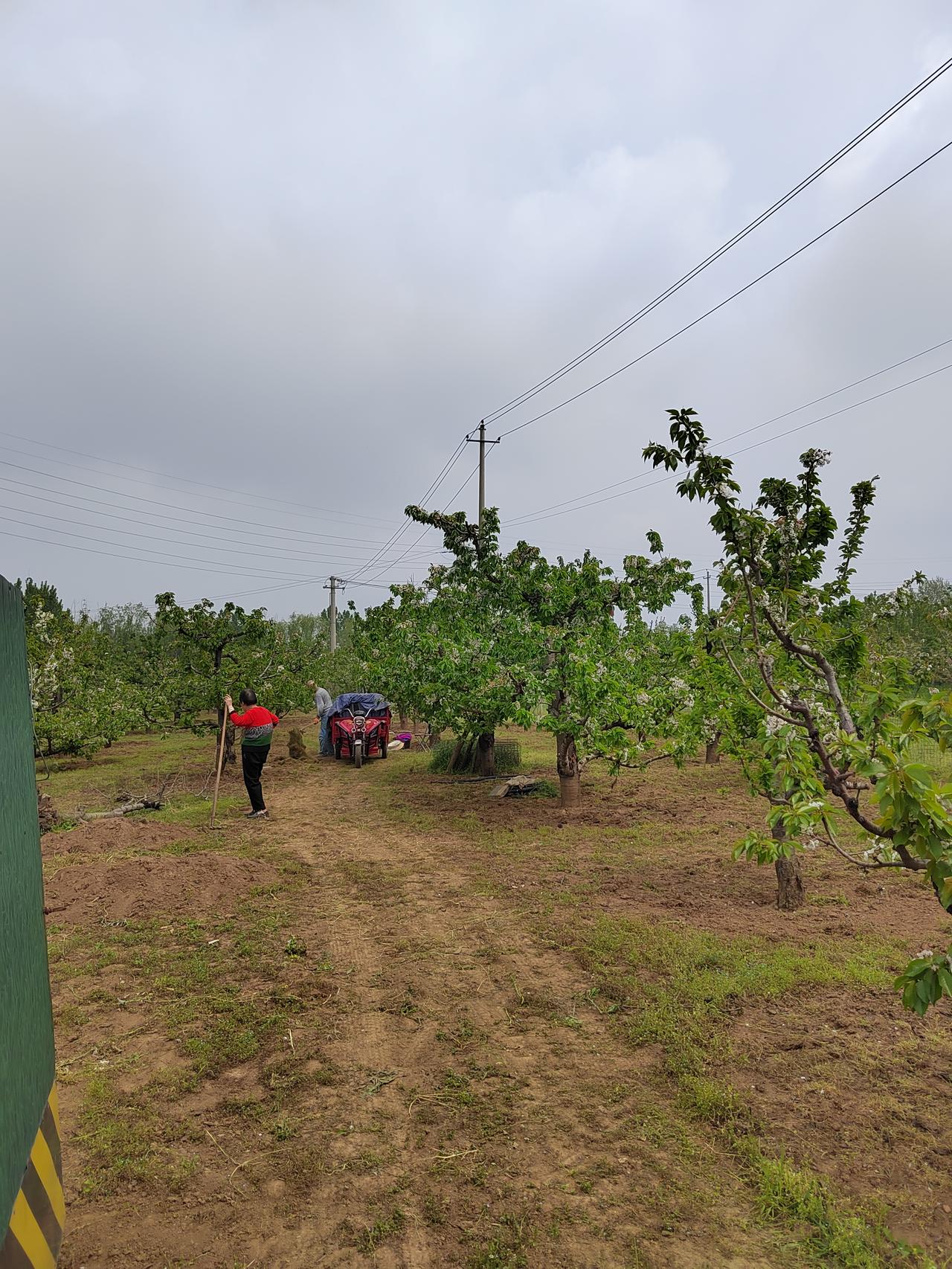 走近白鹿原狄寨附近连绵不断的樱桃园,发现多半已经花落坐果,正是花褪香残樱桃小,已结了豆粒大的果实。也有少量比较晚的品种,簇拥的花朵一树洁白。有果农在树下翻土施肥。旁边大棚里的草莓已经到了最后关头,草莓不太多,但依然在采摘出售。