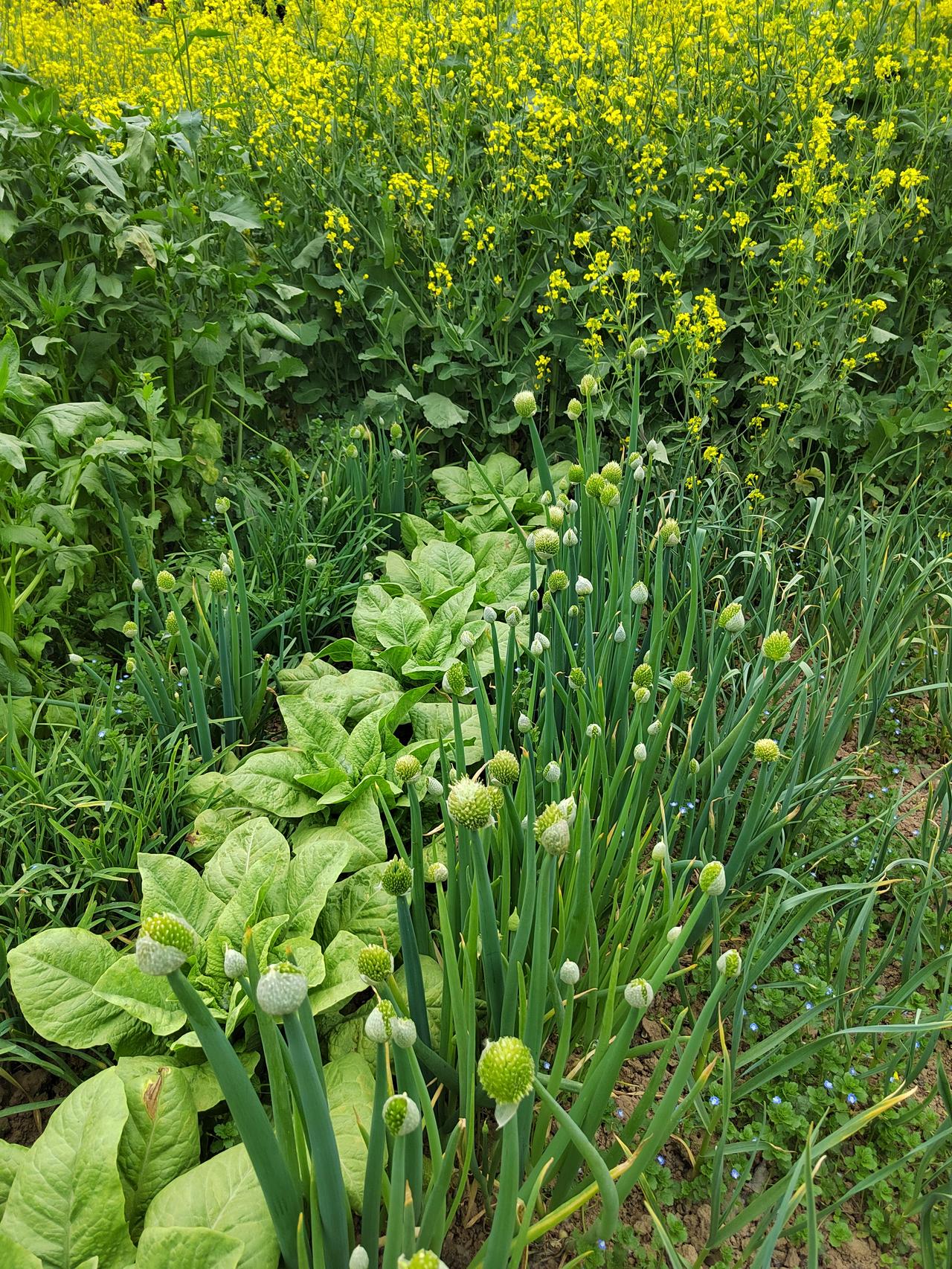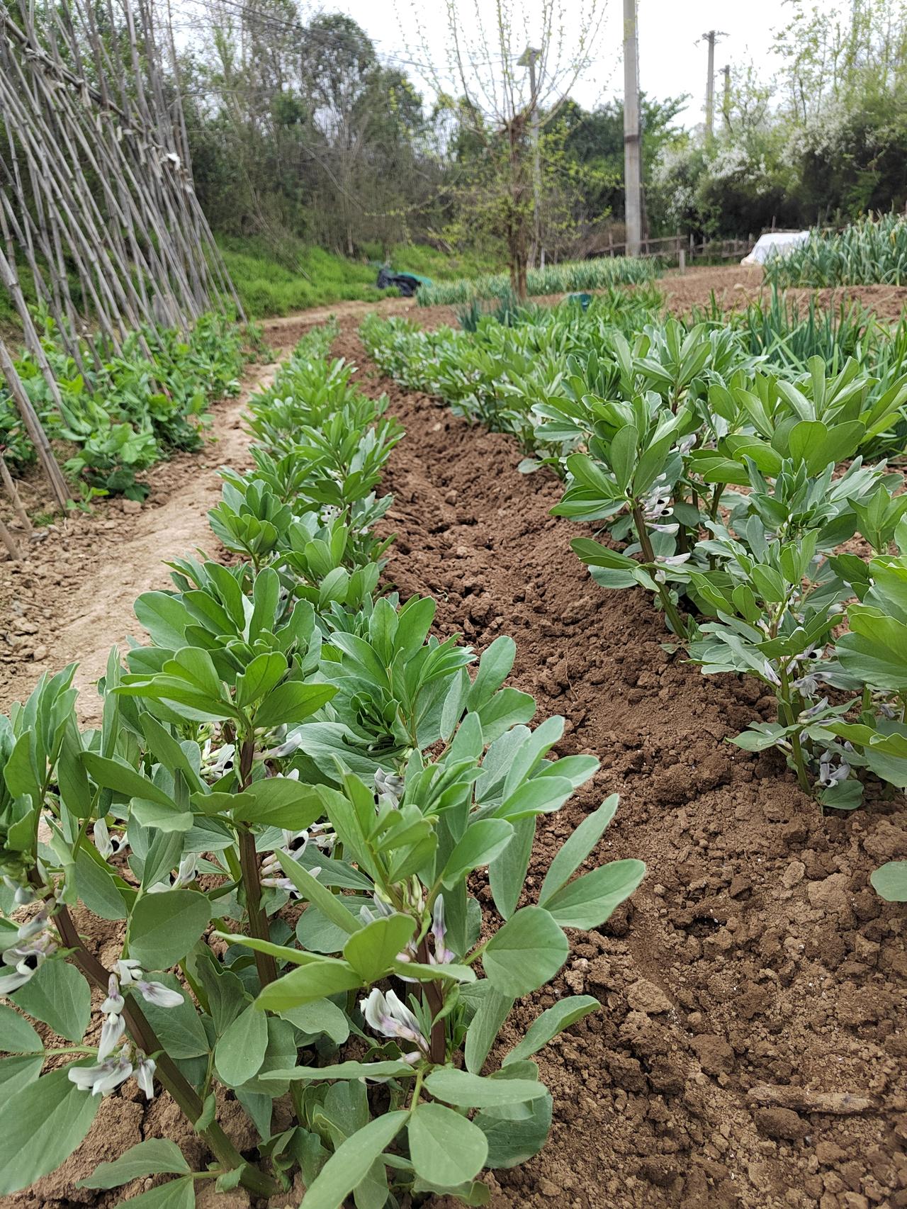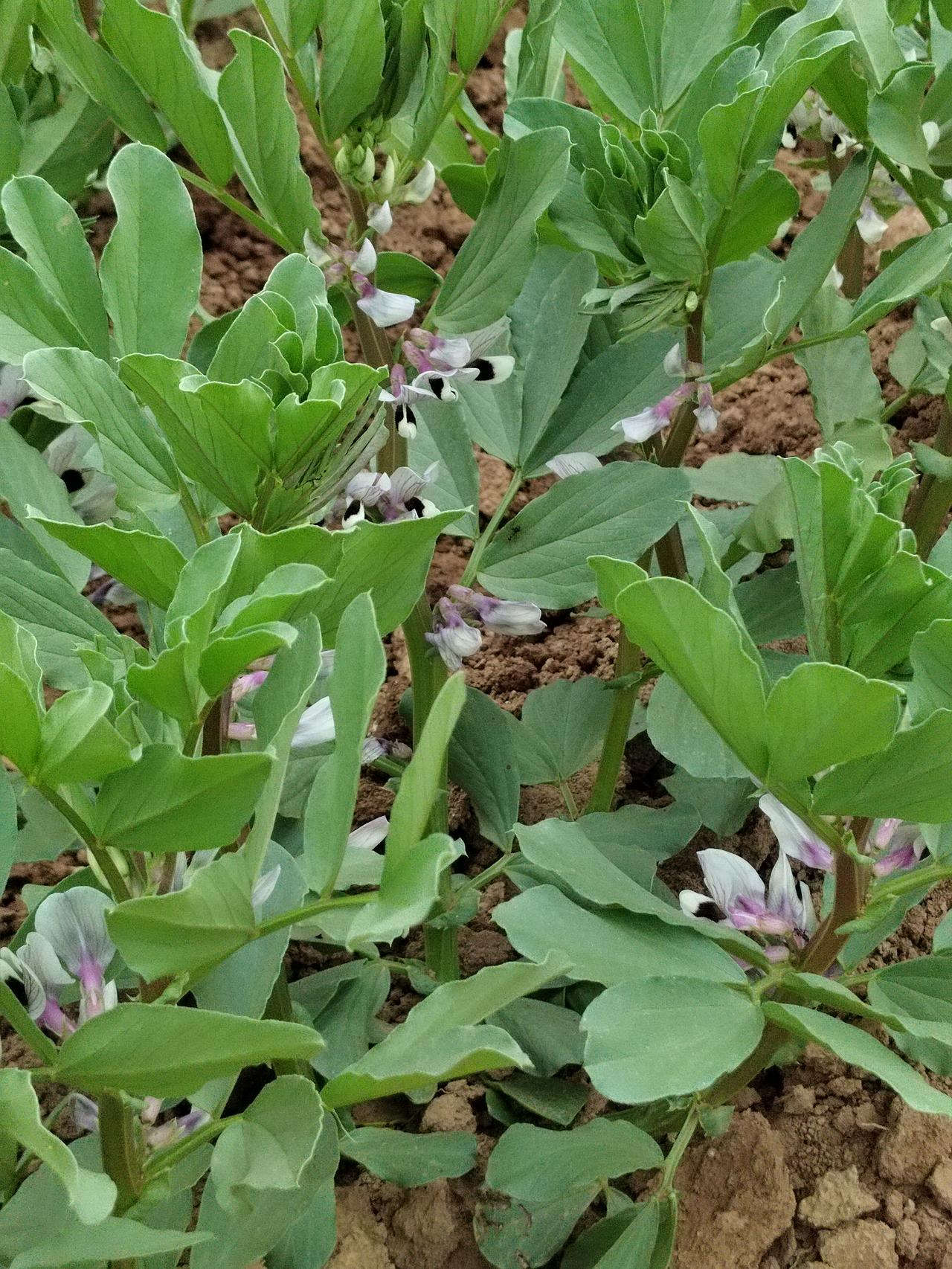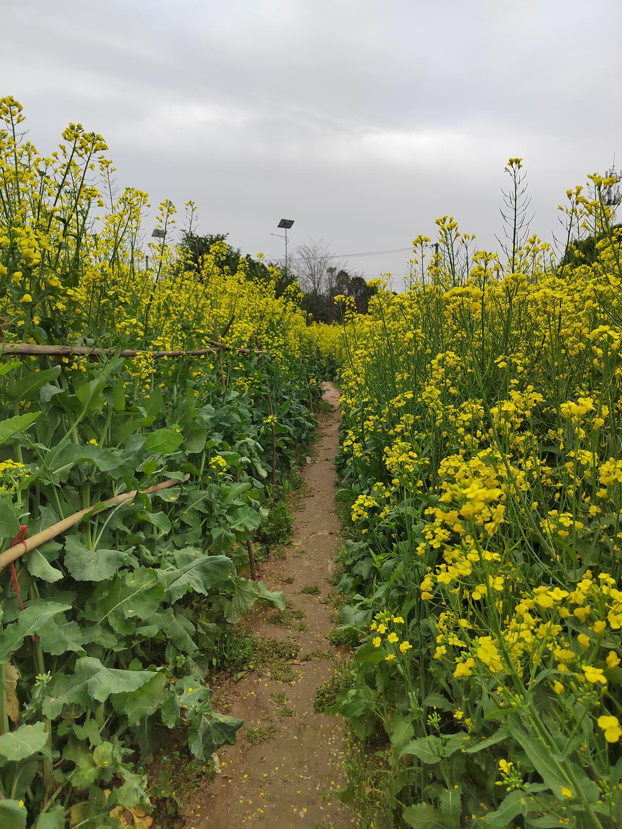 我信步穿过路边的一片油莱花田,走进一户农家的菜园,里面的蔬菜品种丰富极了,有老葱小葱、蒜苗、油麦菜、青菜、韭菜,生菜、还有开着紫色花的蚕豆,搭好了架子尚未吐蔓的豆角等等,每个品种的量都不大,应该是为自己家准备的。我想这菜园子的主人一定是个非常勤劳的有责任心的人。