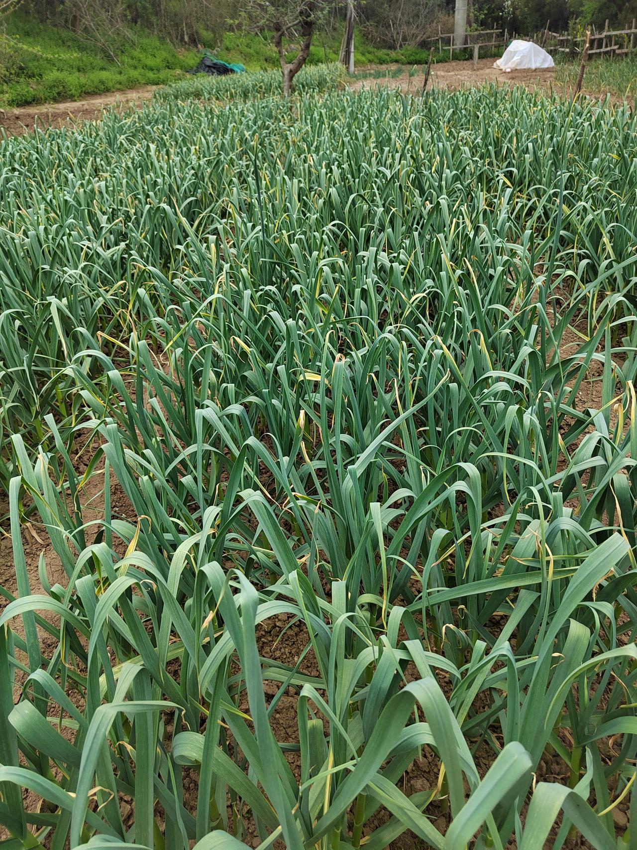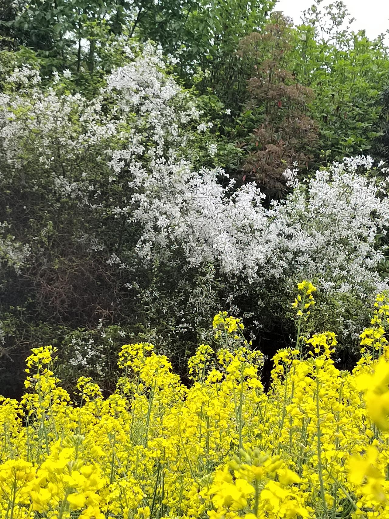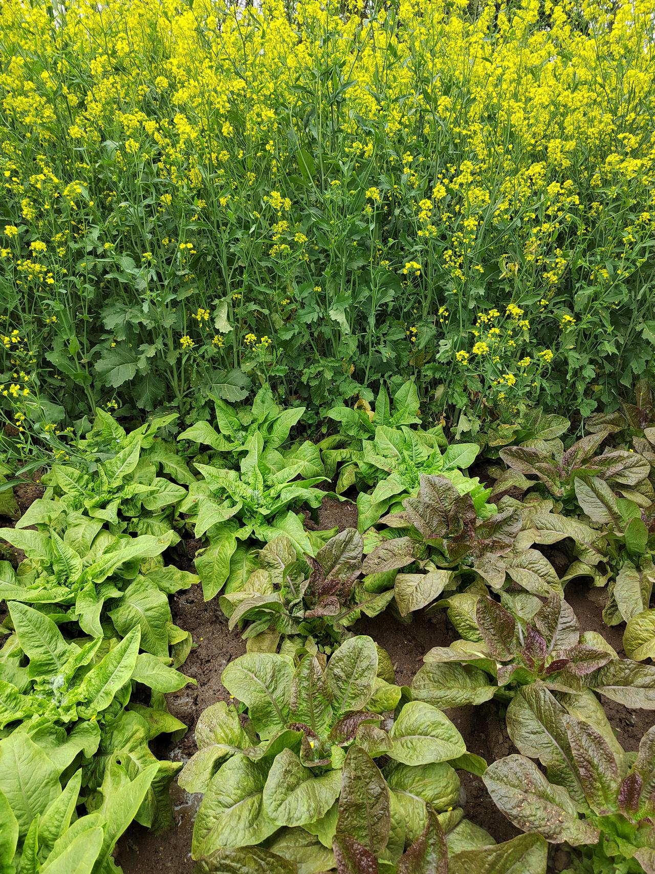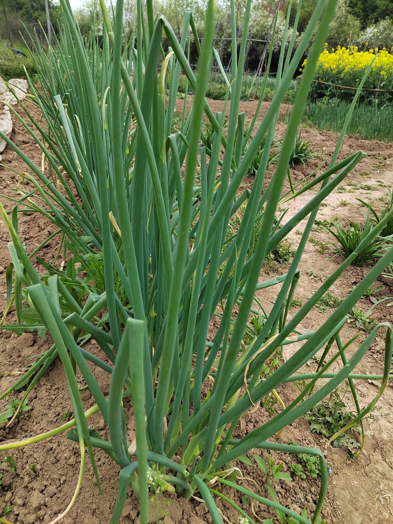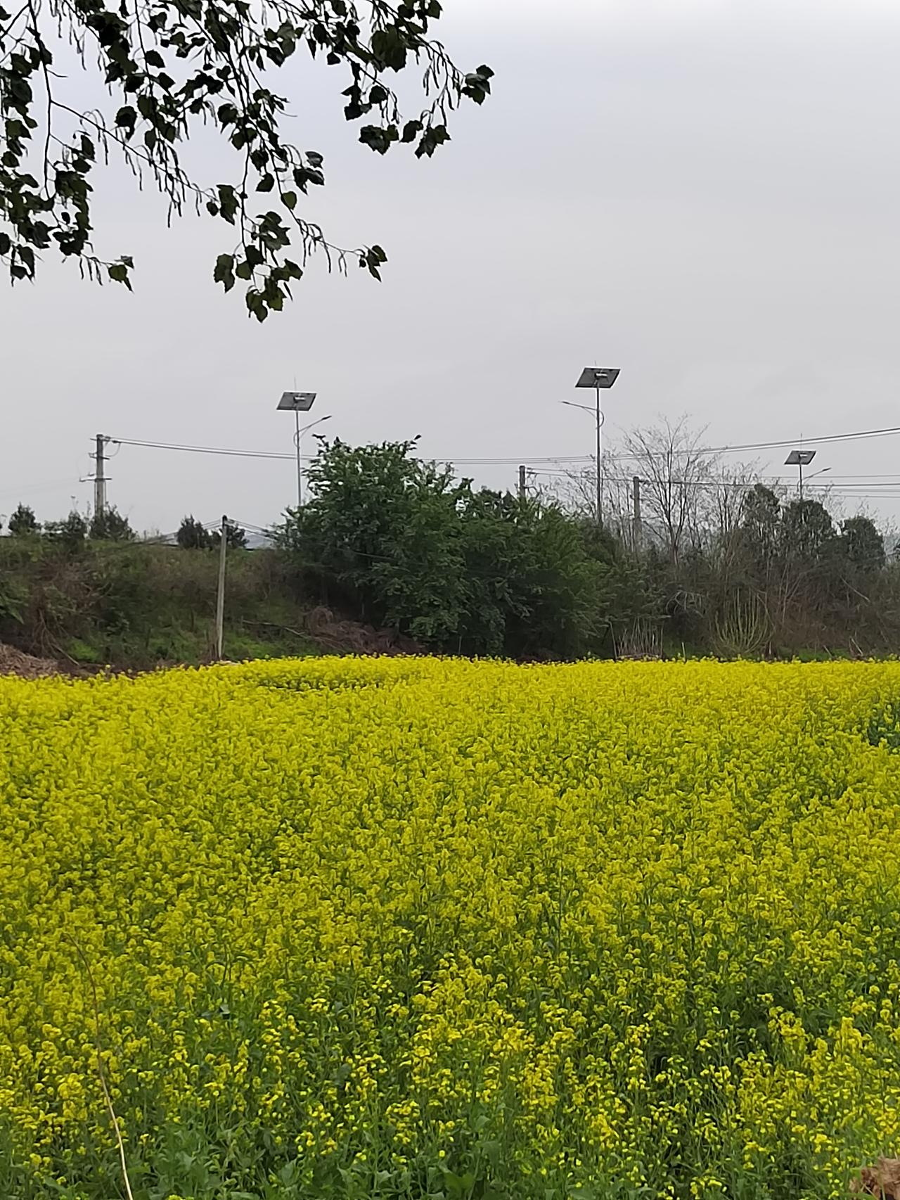 我信步穿过路边的一片油莱花田,走进一户农家的菜园,里面的蔬菜品种丰富极了,有老葱小葱、蒜苗、油麦菜、青菜、韭菜,生菜、还有开着紫色花的蚕豆,搭好了架子尚未吐蔓的豆角等等,每个品种的量都不大,应该是为自己家准备的。我想这菜园子的主人一定是个非常勤劳的有责任心的人。