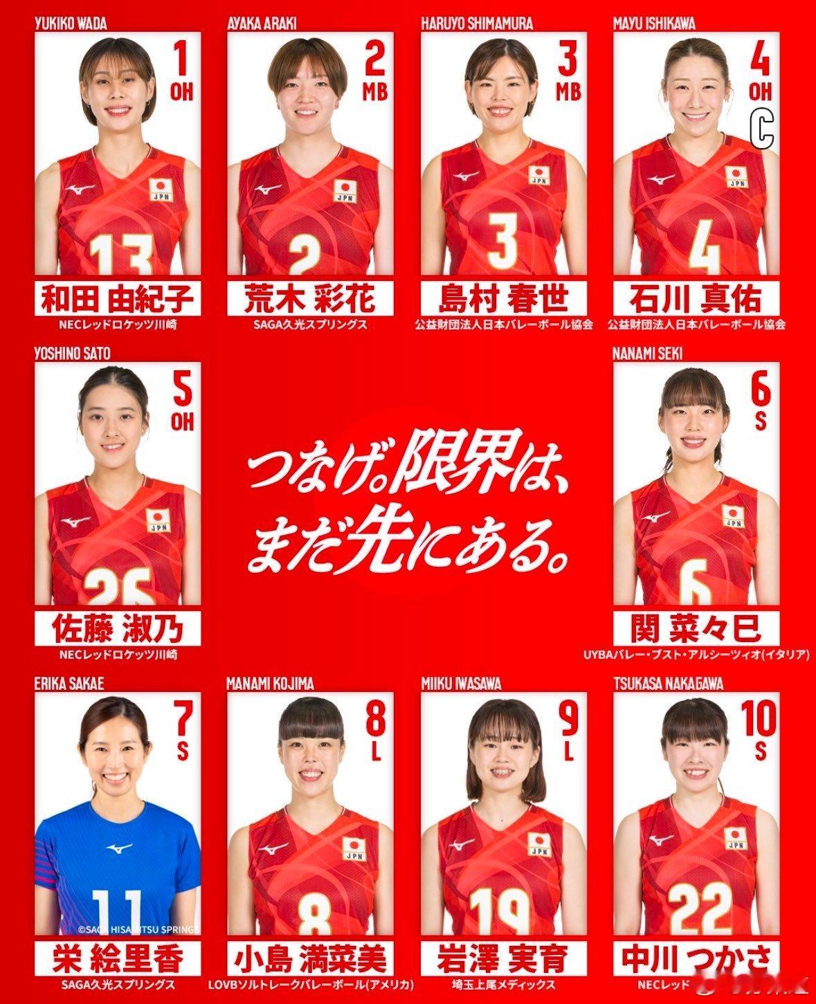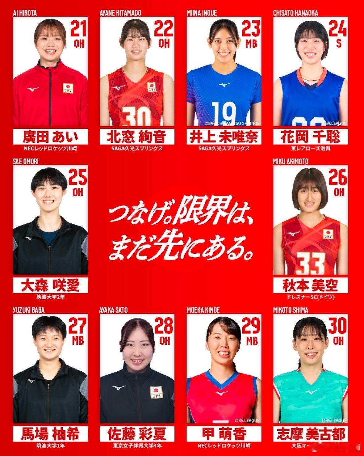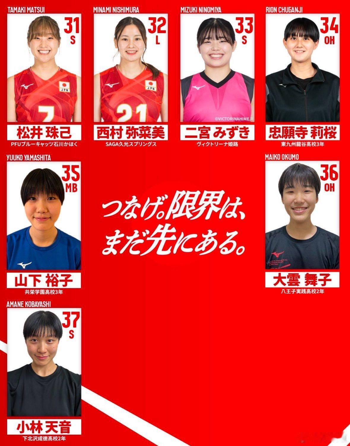 此外,本次名单中有14名球员为首次入选。其中包括SAGA久光泉的二传手荣绘里香,以及东九州龙谷高中三年级的主攻手忠愿寺莉樱等。主教练将继续由费尔哈特·阿克巴什(Ferhat Akbas)担任,队长则由主攻手石川真佑蝉联。