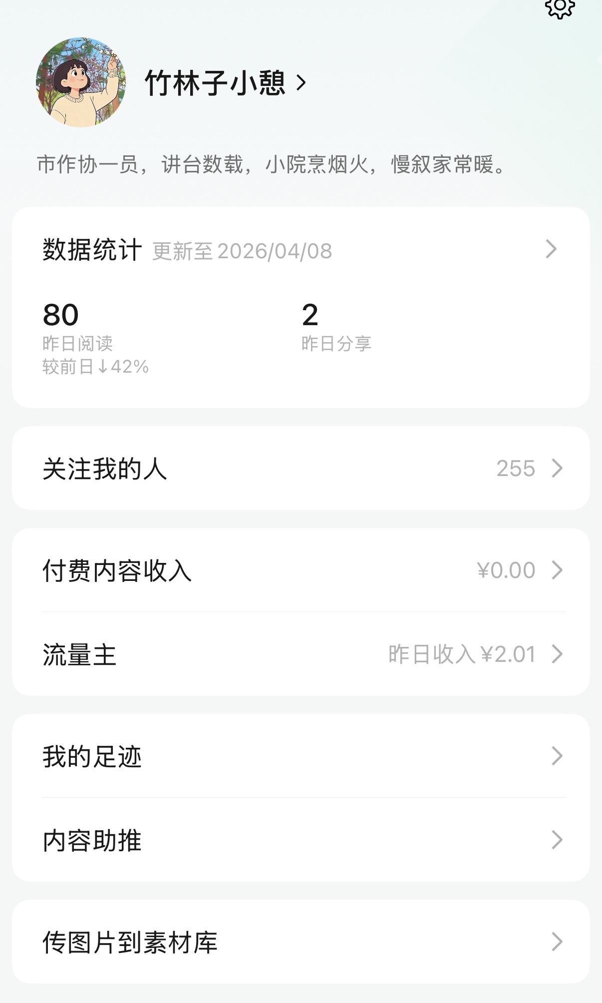 反观我的微信公众号,昨天的阅读量虽然只有80个,但是收入却有2.01元。
