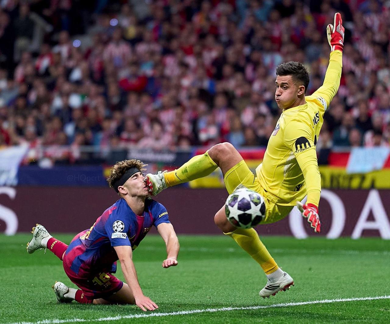 巴萨中场费尔明,头球攻门后落地时头刚好撞上了马竞门将穆索的鞋底。