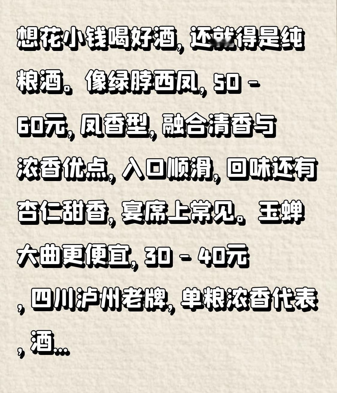 想花小钱喝好酒,还就得是纯粮酒。像绿脖西凤,50 - 60元,凤香型,融合清香与浓香优点,入口顺滑,回味还有杏仁甜香,宴席上常见。玉蝉大曲更便宜,30 - 40元,四川泸州老牌,单粮浓香代表,酒体清澈,果香浓郁,口感绵甜醇厚。