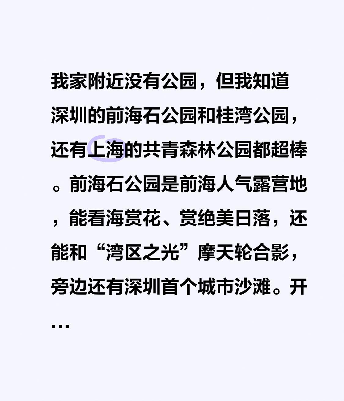 我家附近没有公园,但我知道深圳的前海石公园和桂湾公园,还有上海的共青森林公园都超棒。