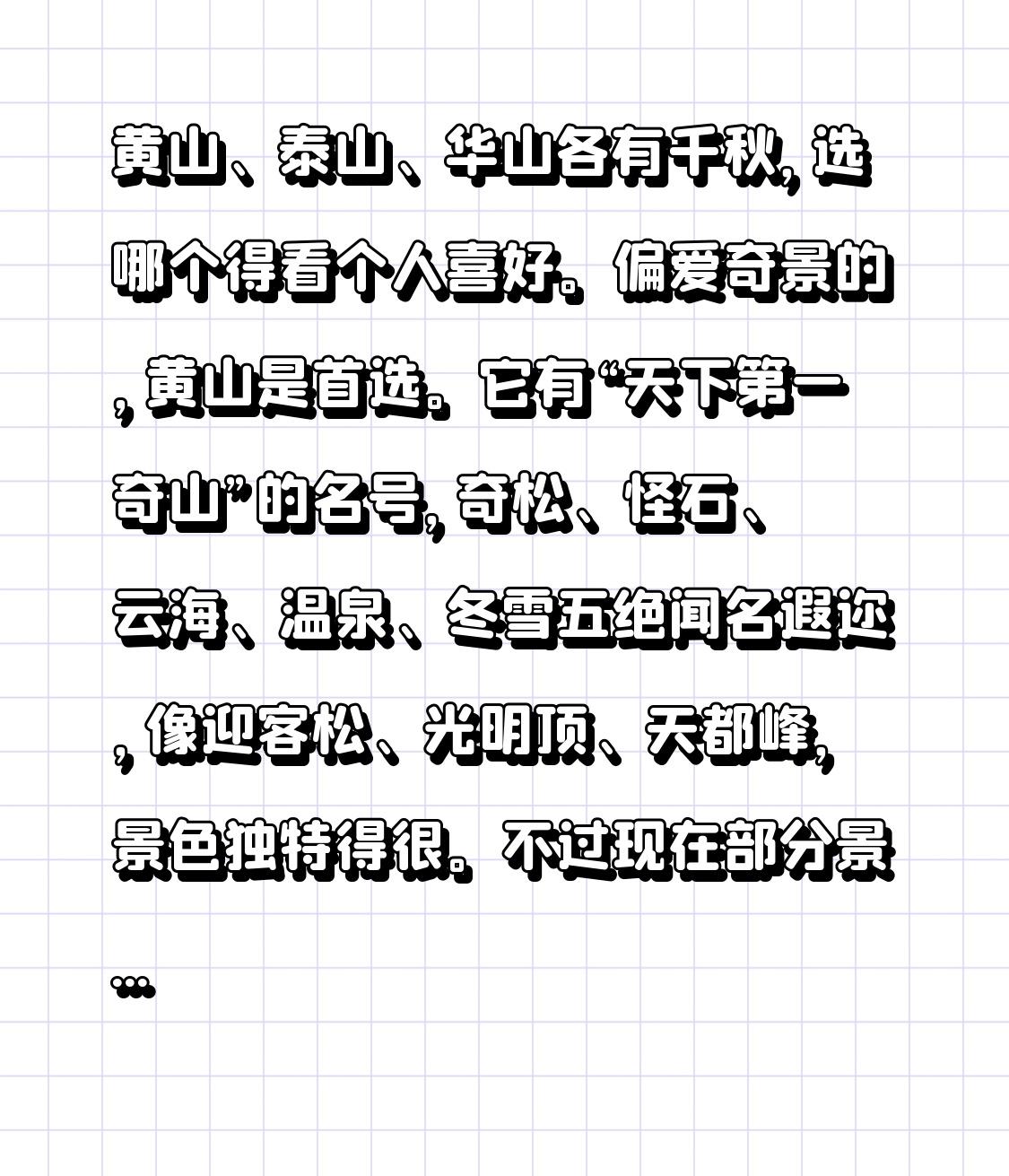 黄山、泰山、华山各有千秋,选哪个得看个人喜好。