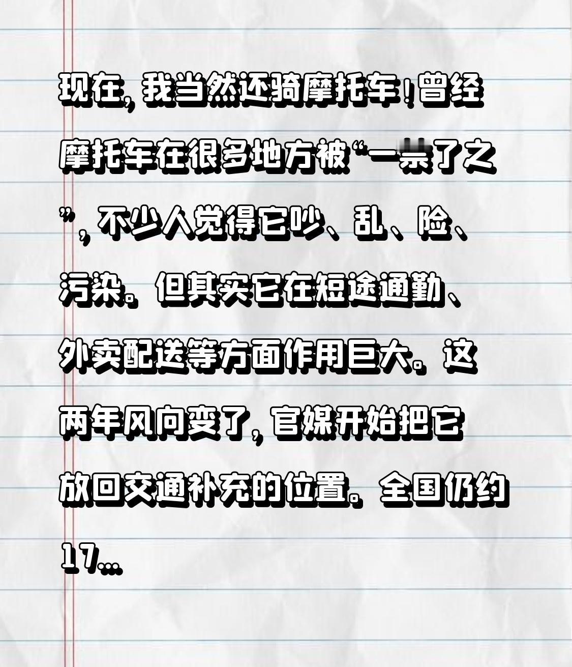 现在,我当然还骑摩托车!曾经摩托车在很多地方被“一禁了之”,不少人觉得它吵、乱、险、污染。但其实它在短途通勤、外卖配送等方面作用巨大。这两年风向变了,官媒开始把它放回交通补充的位置。全国仍约170个大中城市严格禁限摩,仅30多个全面解禁。像西安、济南等解禁城市,路面秩序也没垮。