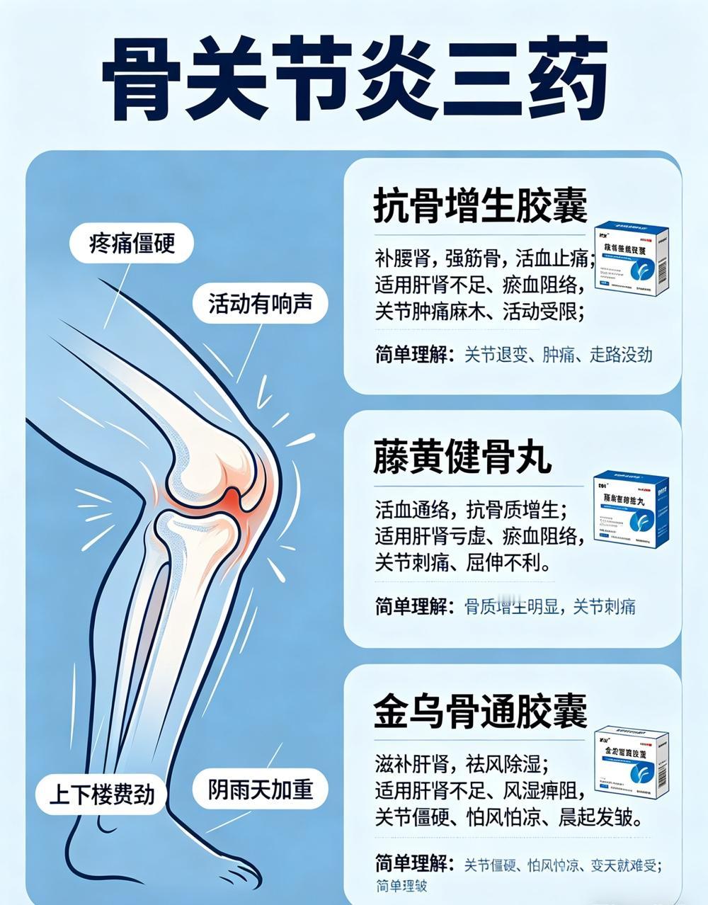 骨关节炎:肿痛抗骨增生,刺痛藤黄健骨,怕凉金乌骨通。